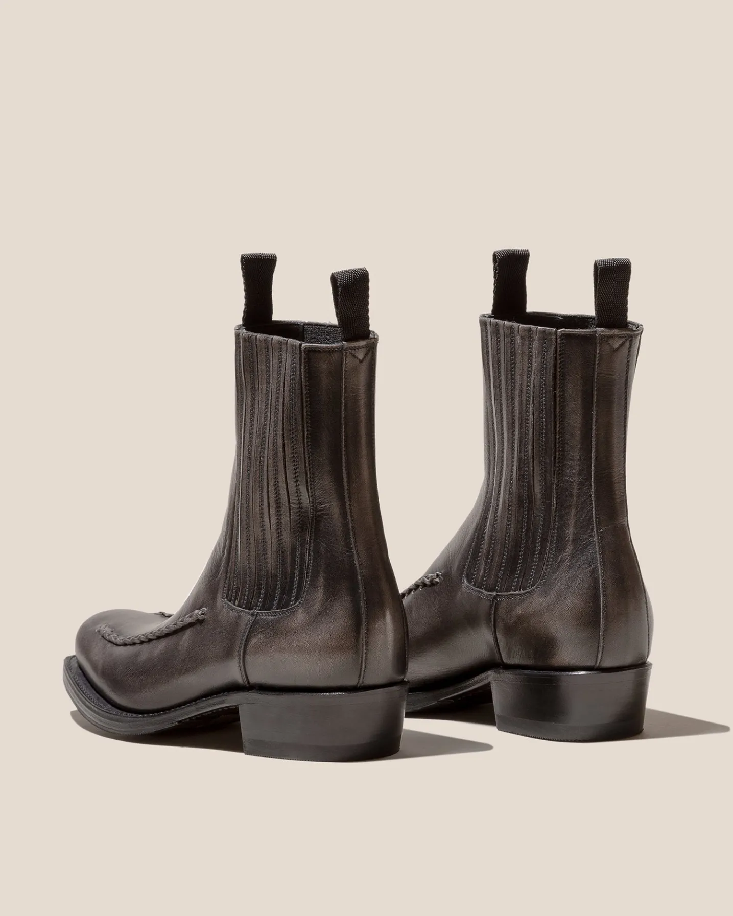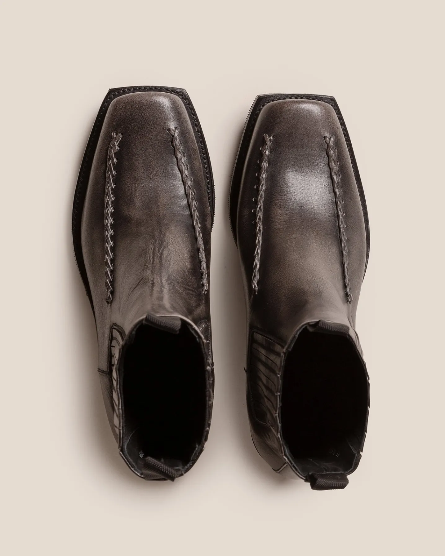 Square toe chelsea boot with braided details, crafted in brushed calf leather.