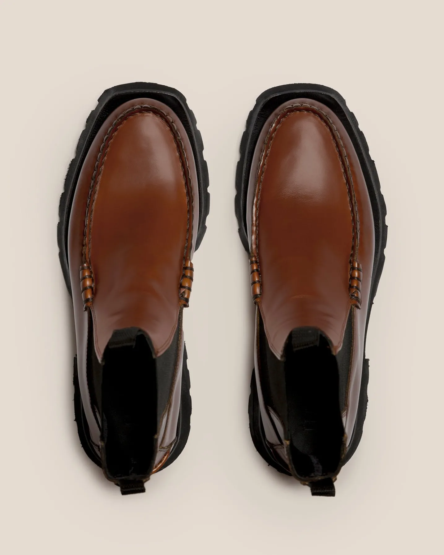Mid-calf Chelsea boot crafted in Spanish pebbled full-grain calf leather. Hand sewn using the traditional moccasin construction.