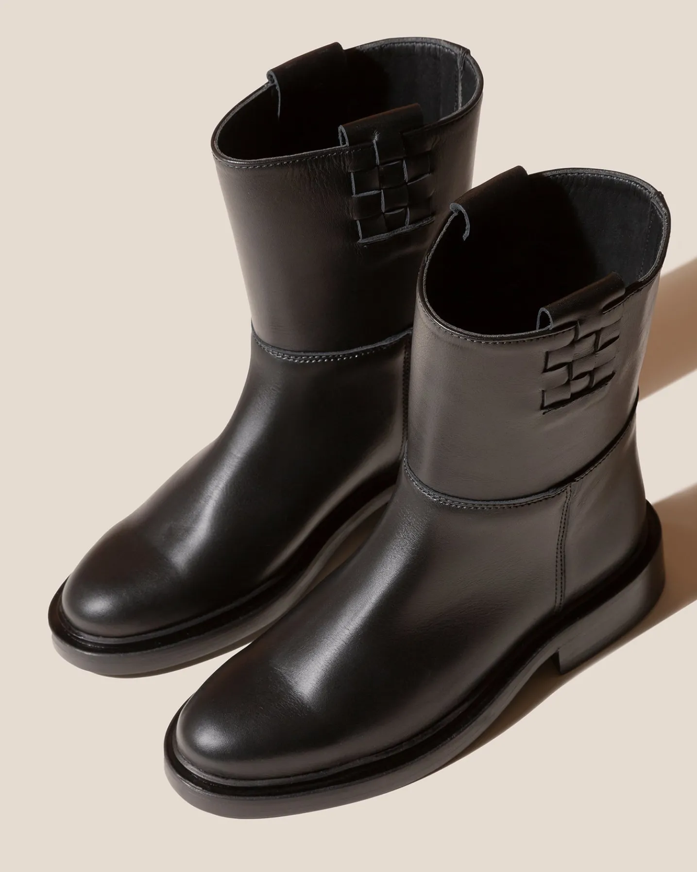 Mid calf pull-on boot with side interwoven detail. Crafted in Spanish calf leather and lined with calf leather lining.