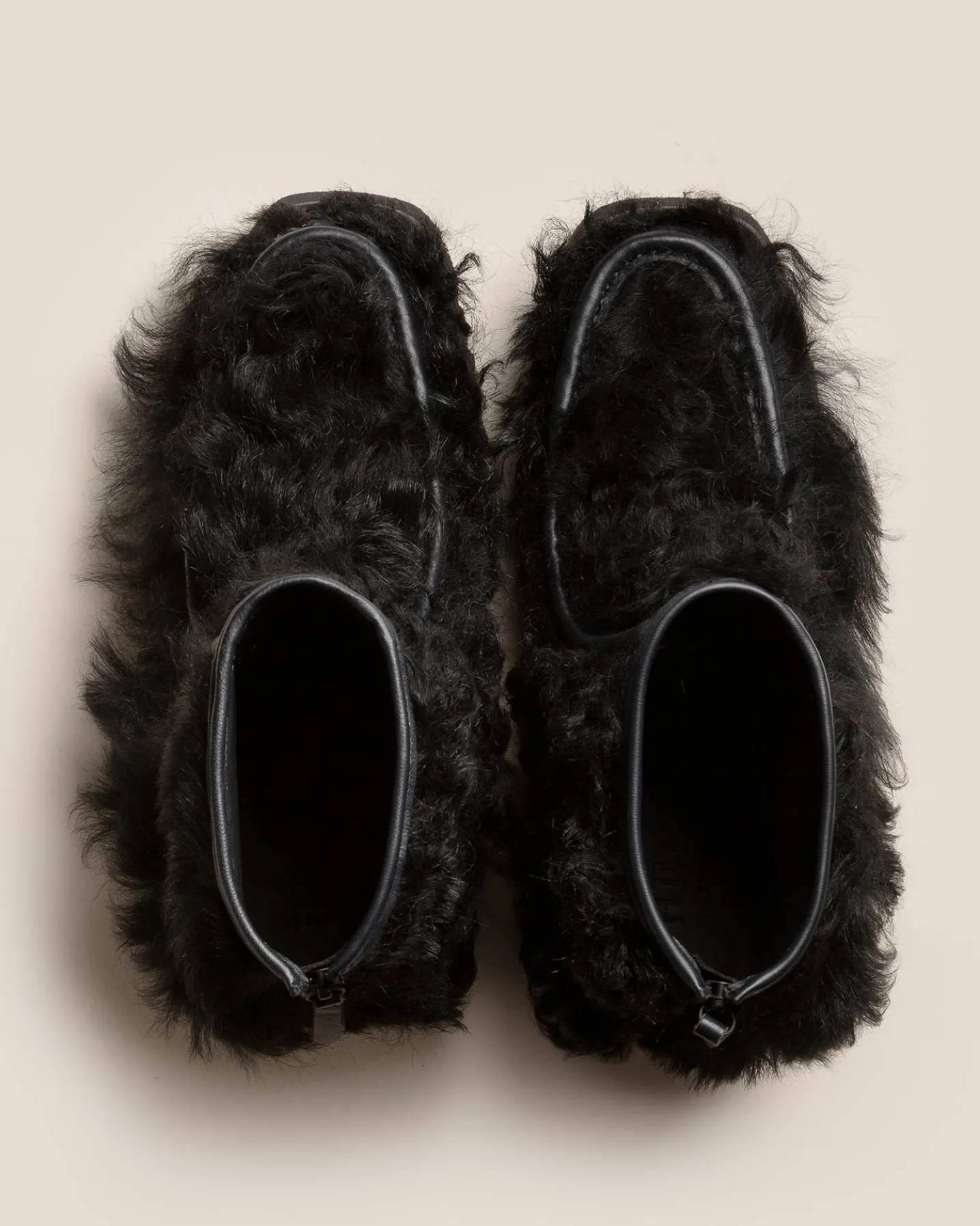 Back zip ankle boot loafer crafted in long hair shearling lambskin, built on a blown rubber tread sole.