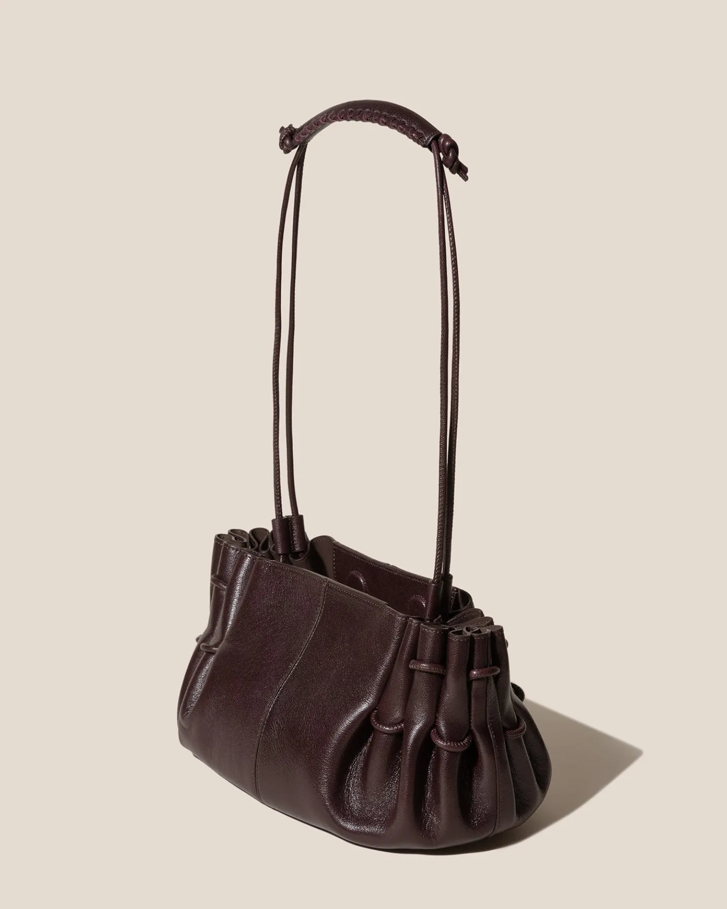 Pleated hand/shoulder bag crafted in supple shiny lambskin.