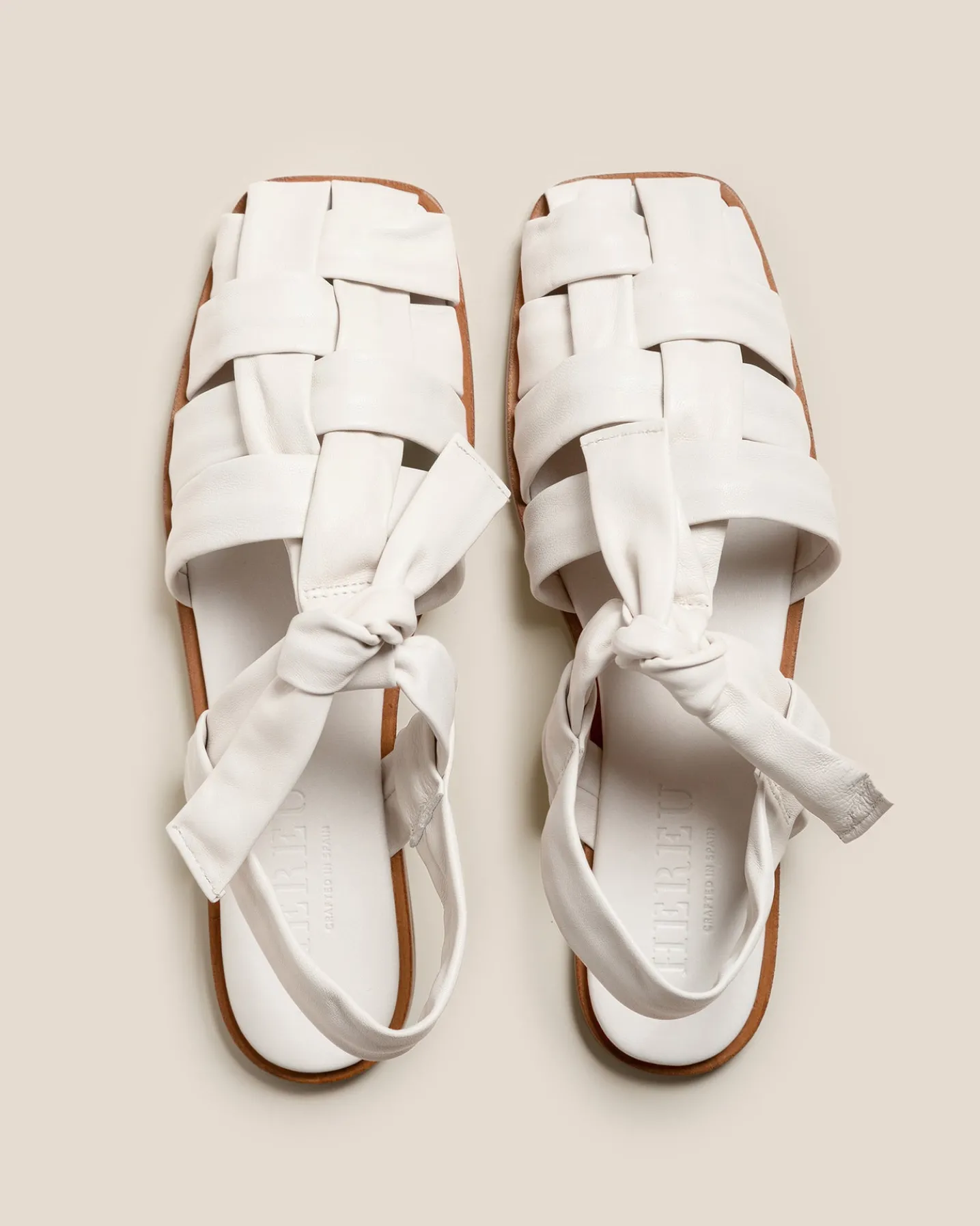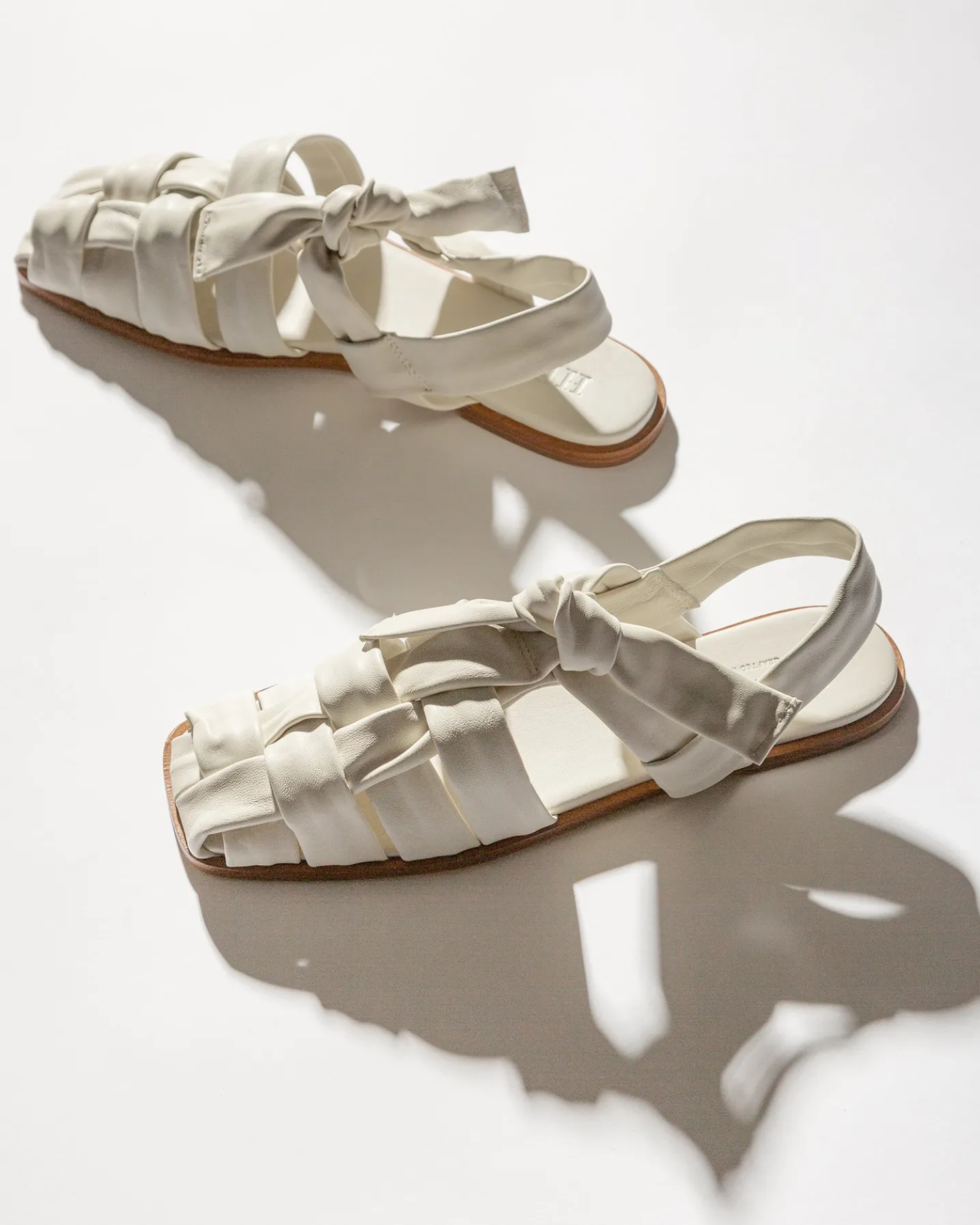 Interwoven knotted t-bar sandal crafted in Italian supple lambskin.