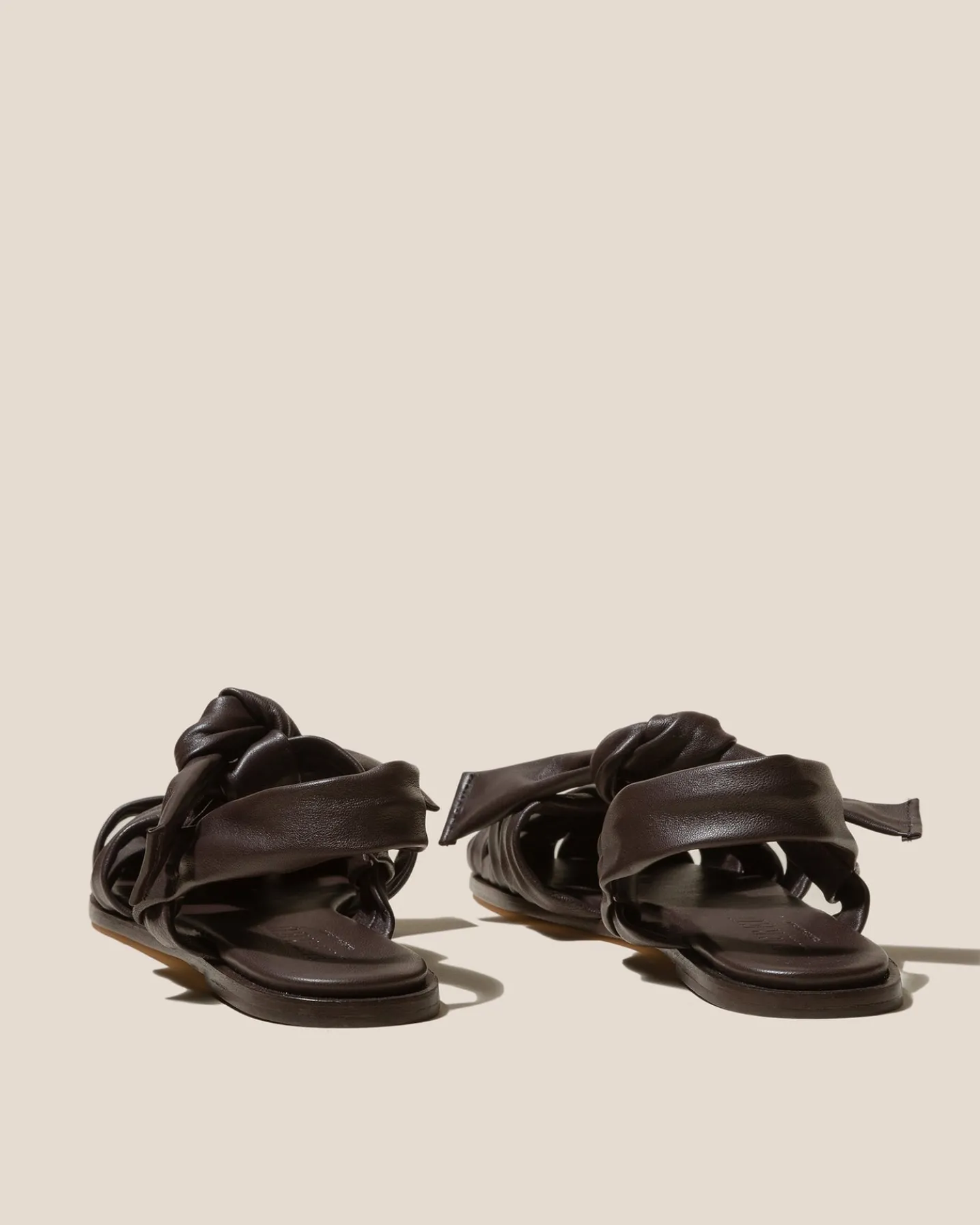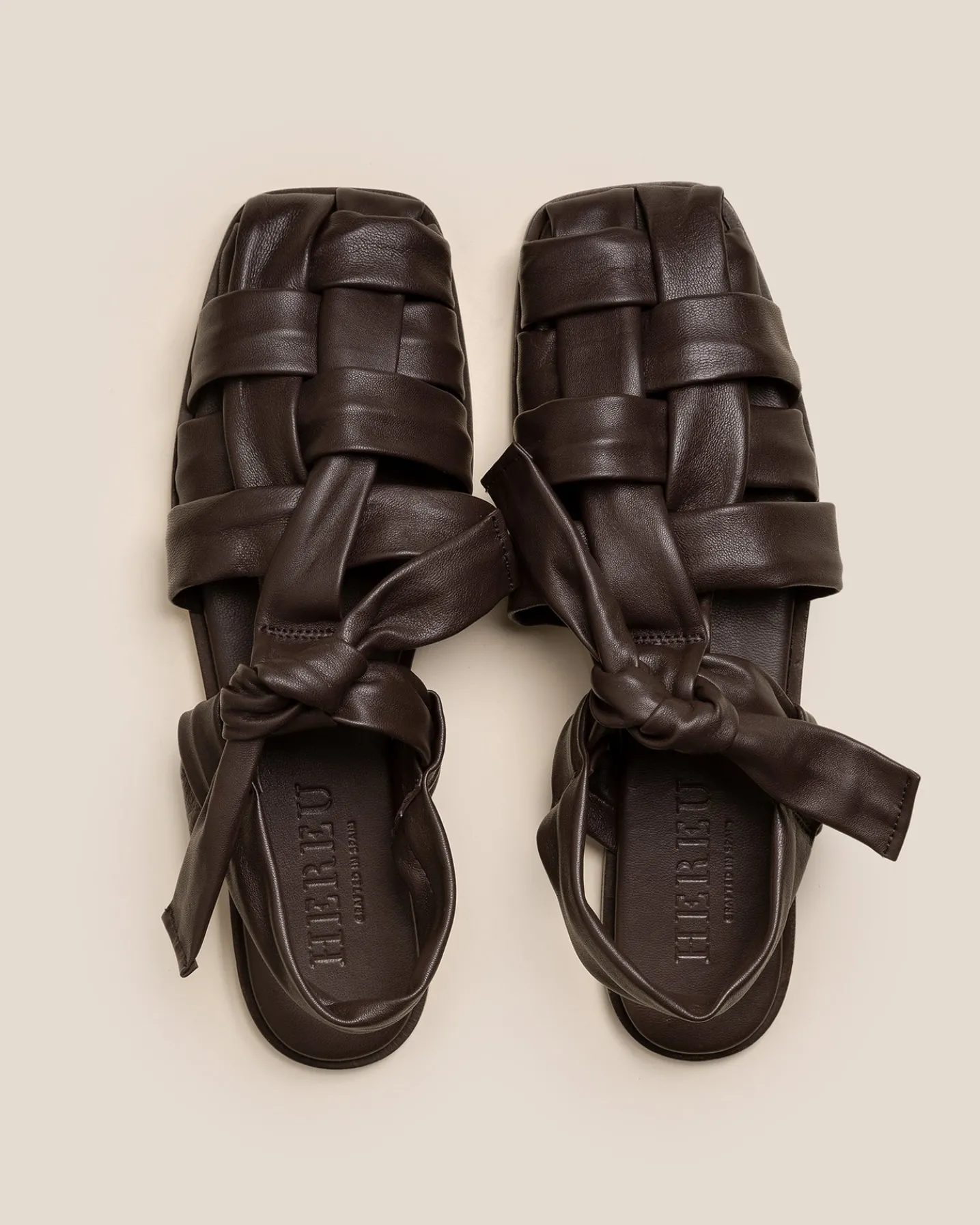 Interwoven knotted t-bar sandal crafted in Italian supple lambskin.