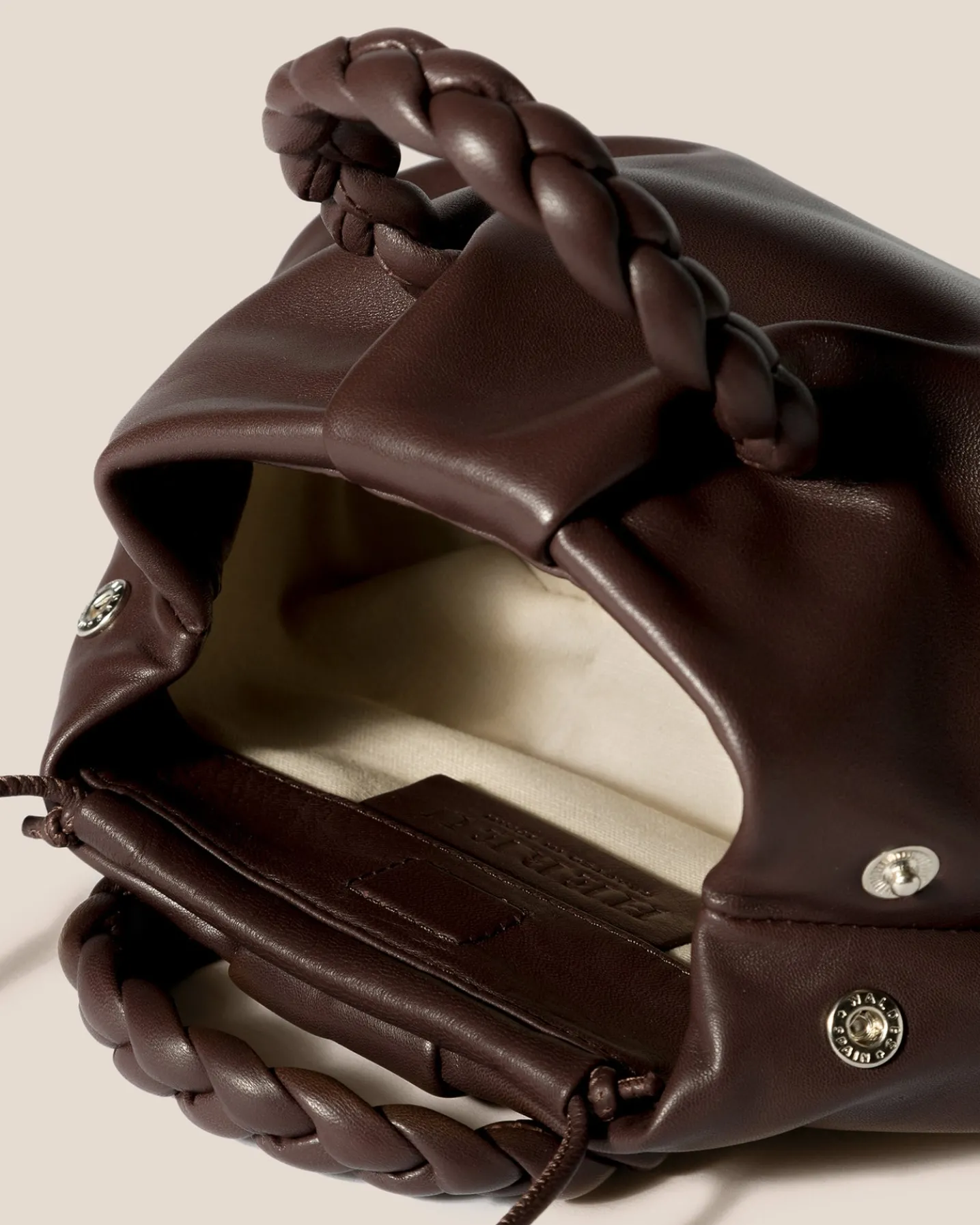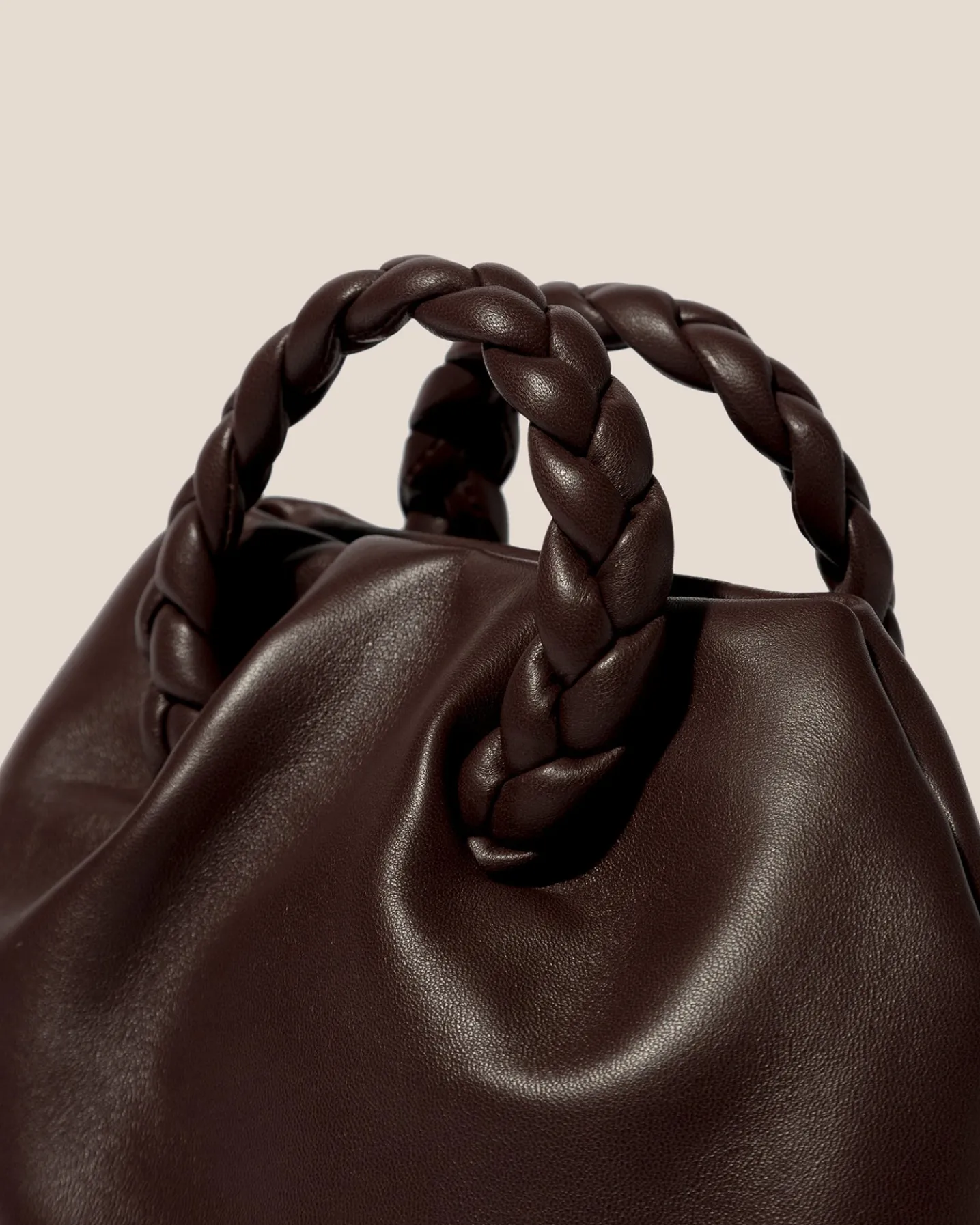 Small leather tote with braided leather handles, crafted in supple lambskin lined with organic cotton canvas.