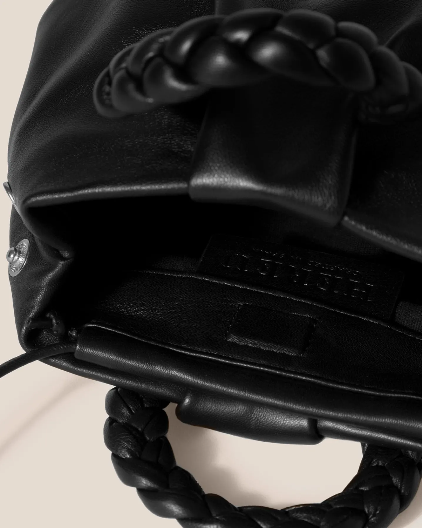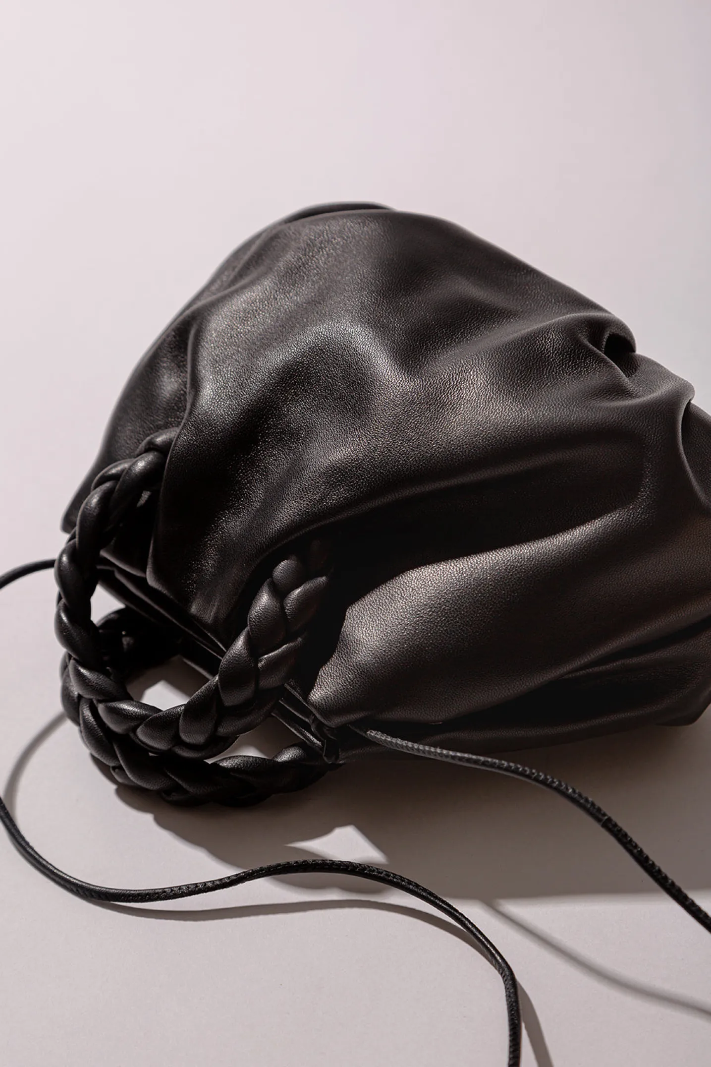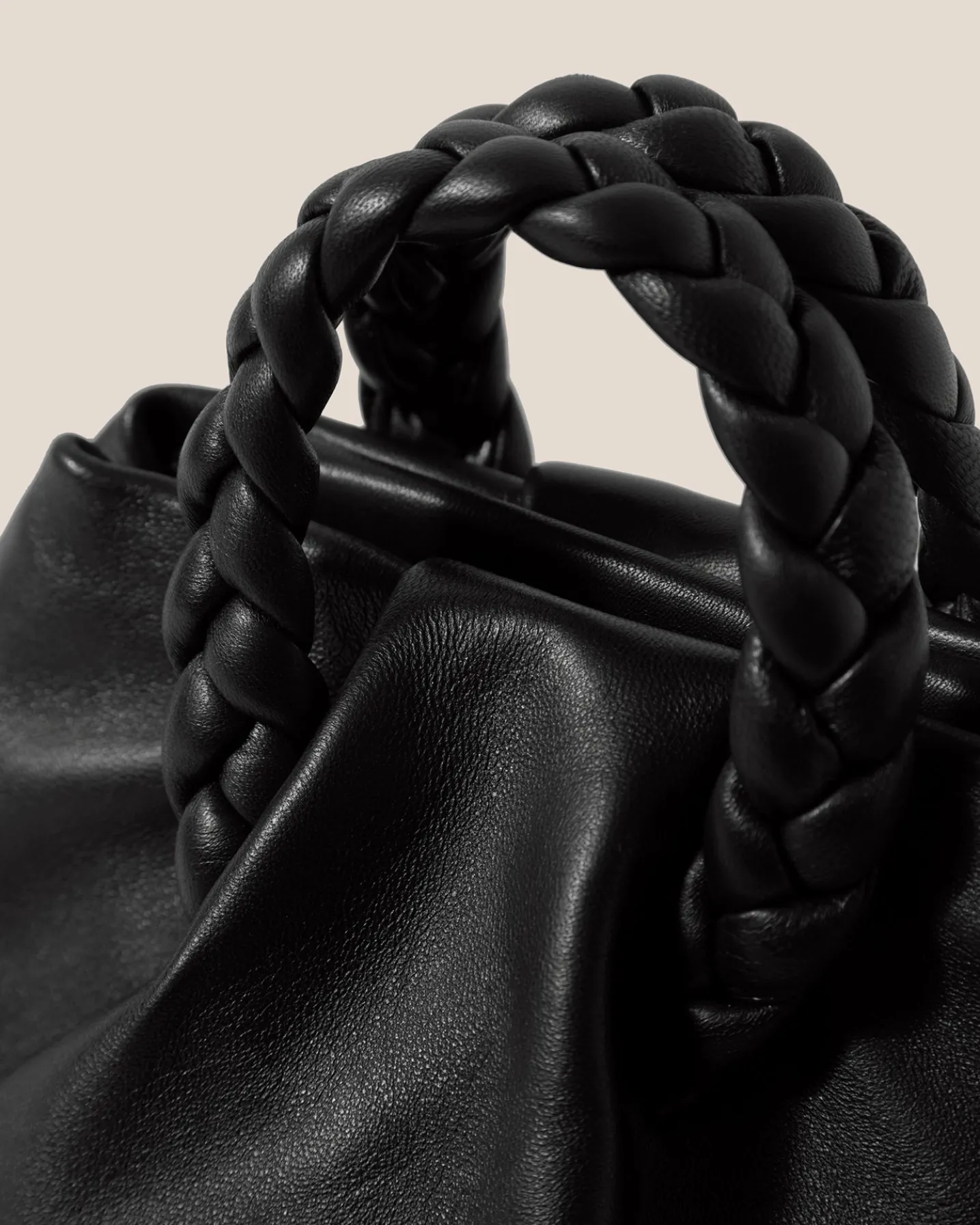 Small leather tote with braided leather handles, crafted in supple lambskin lined with organic cotton canvas.
