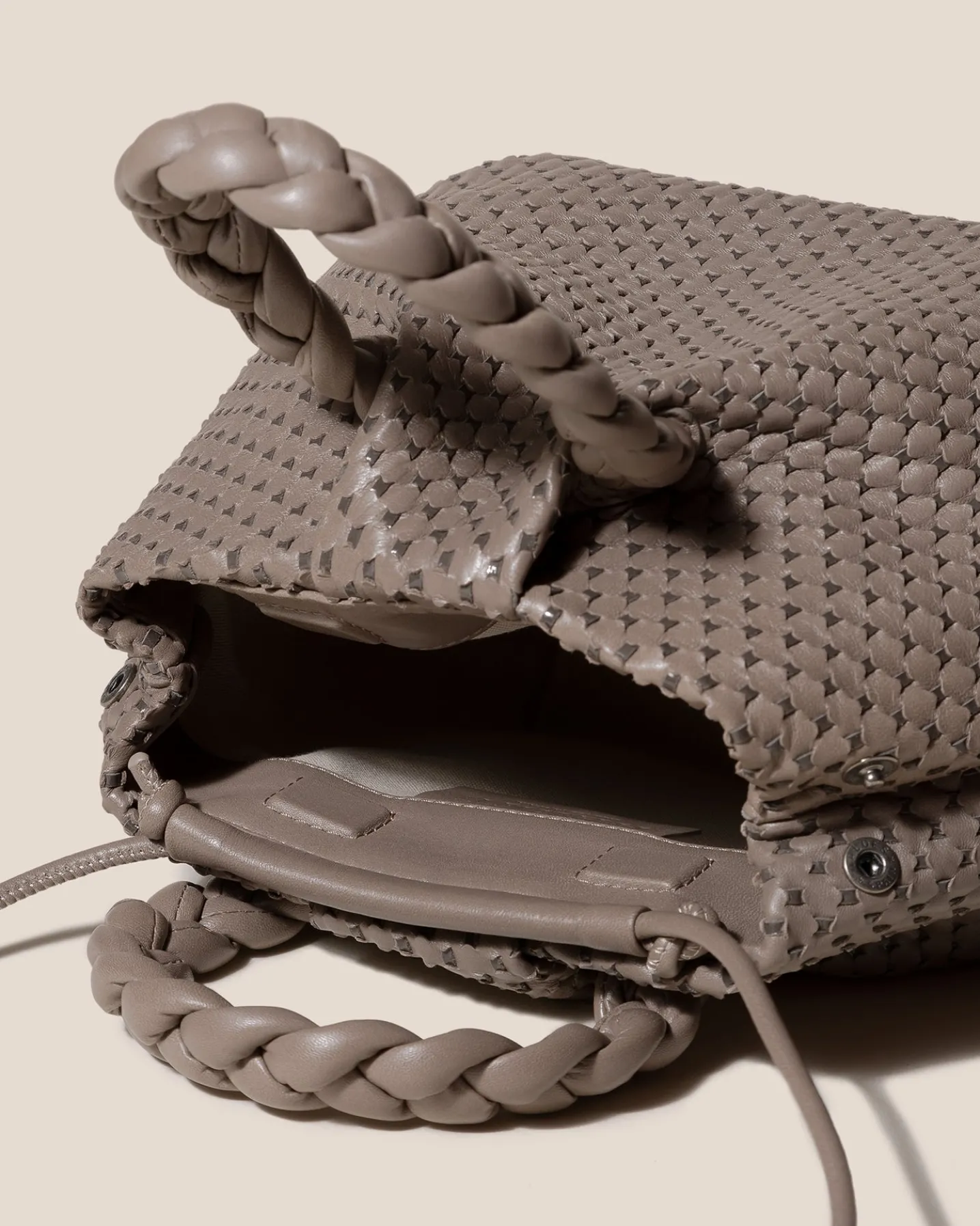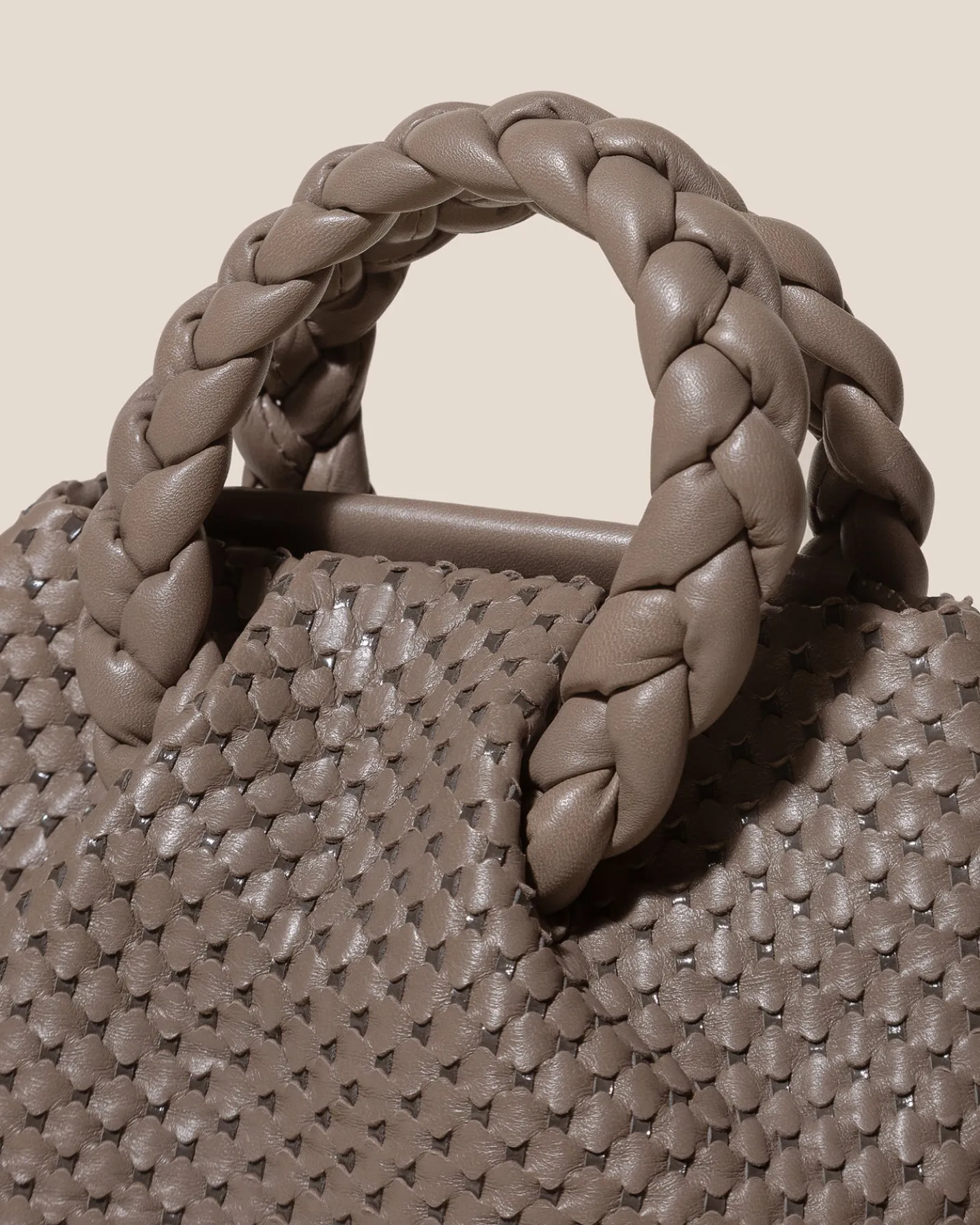 Medium leather tote with braided leather handles, crafted in interlaced calf leather lined with organic cotton canvas.