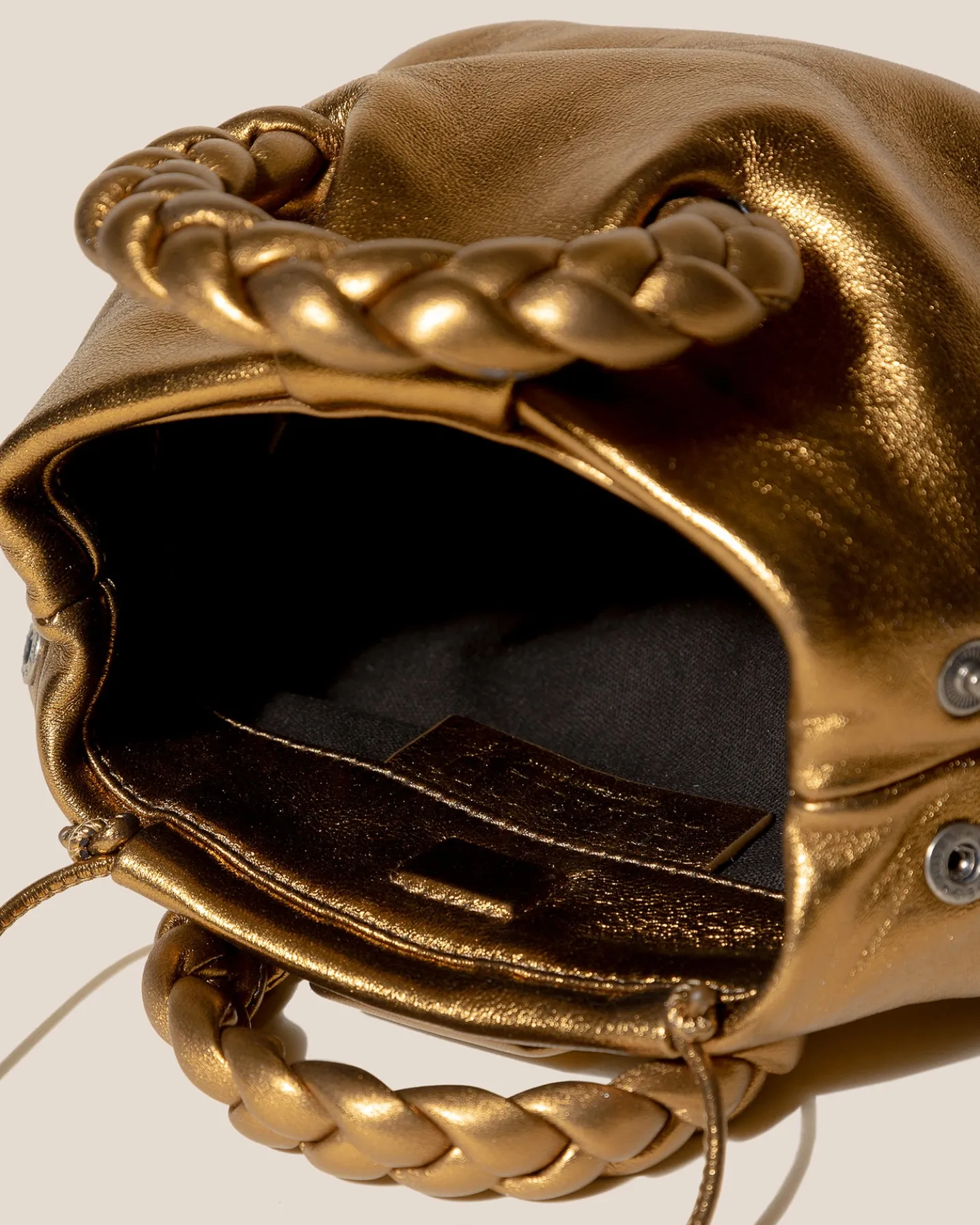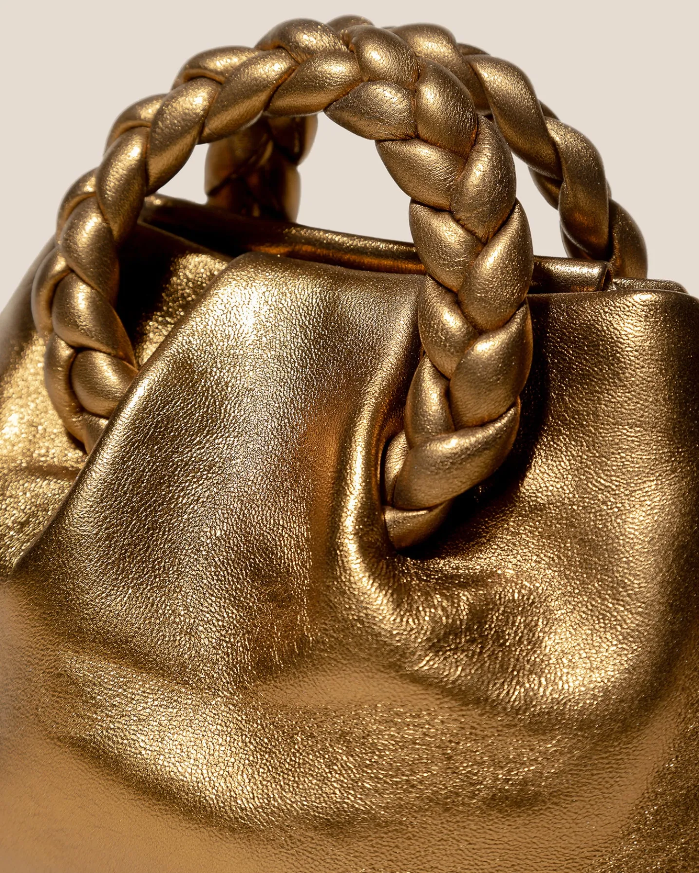 Small metallic leather tote with braided leather handles, crafted in metallic supple lambskin lined with organic cotton canvas.