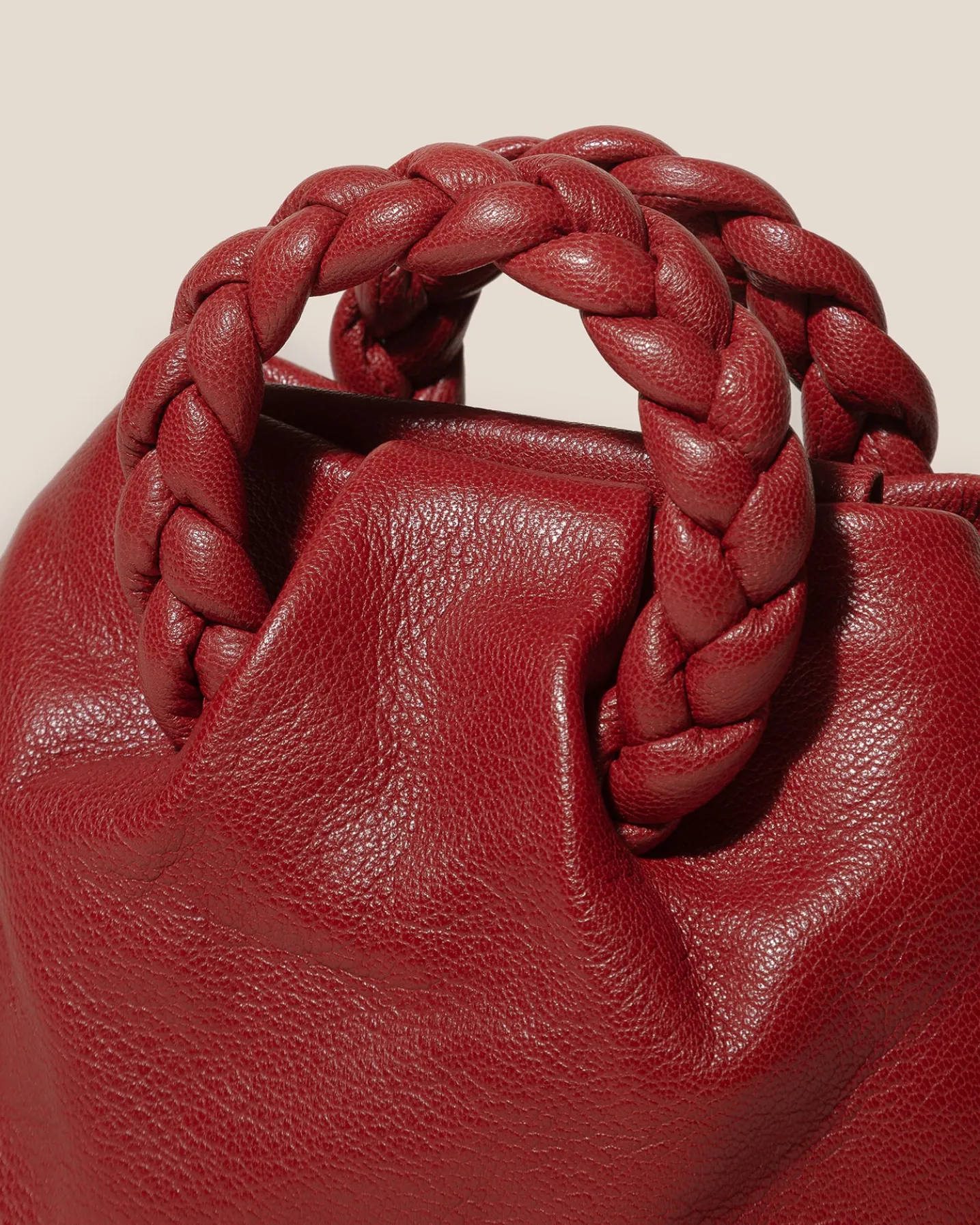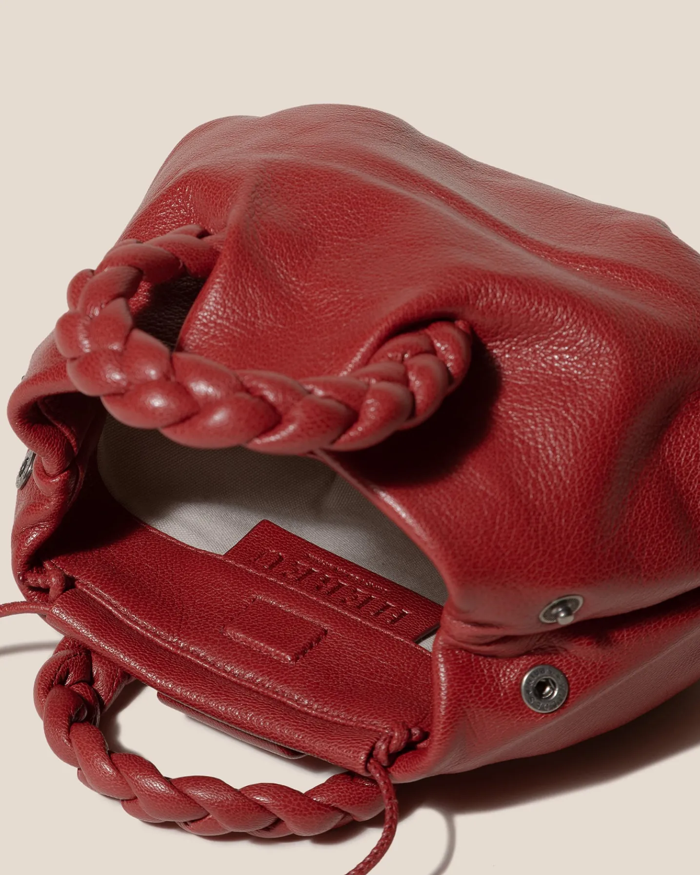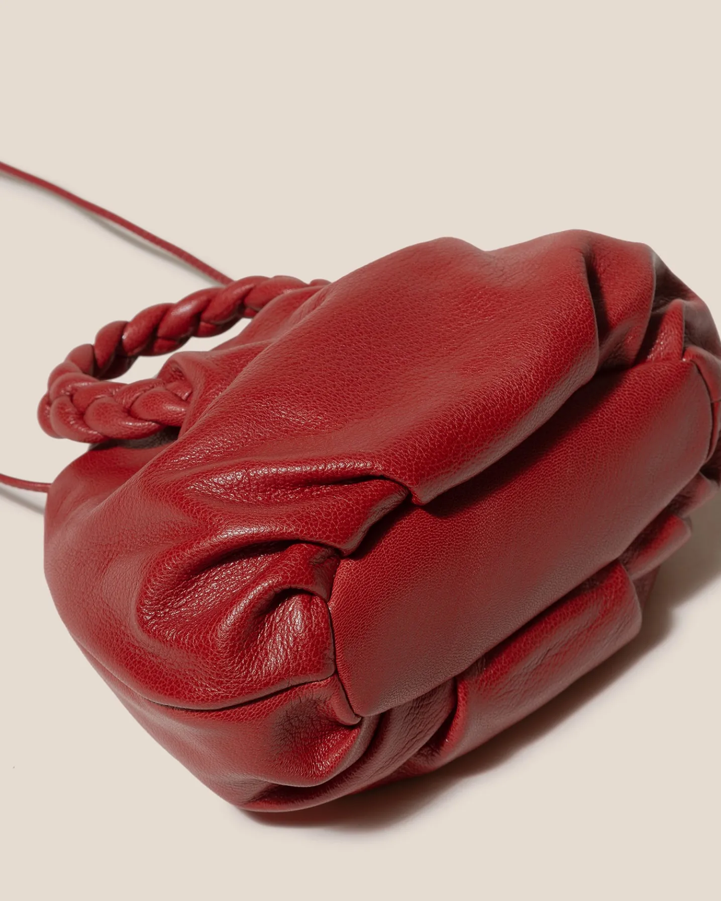 Small leather tote with braided leather handles, crafted in supple shiny lambskin.