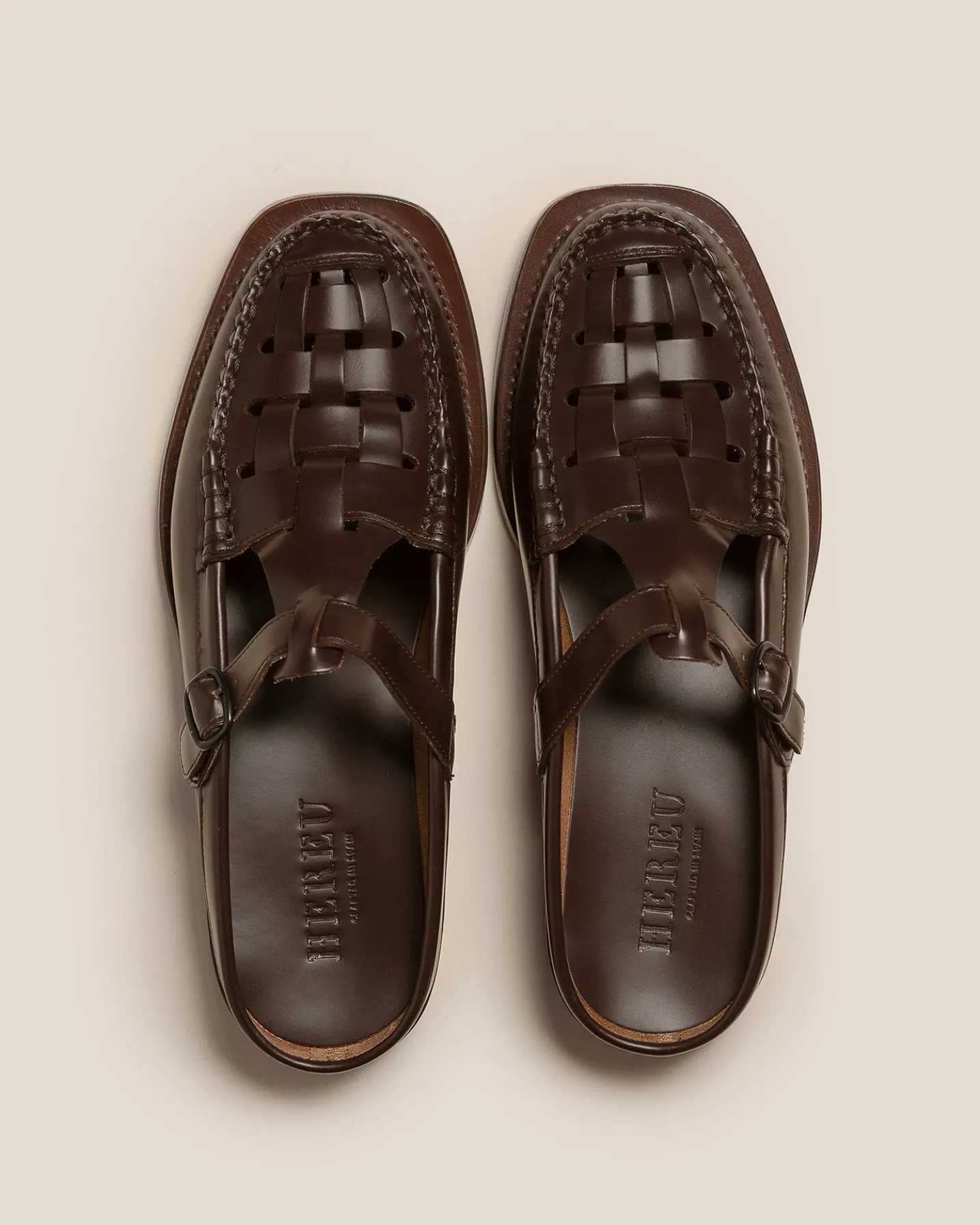 Woven t-bar mule loafer crafted in Spanish structured calf leather.