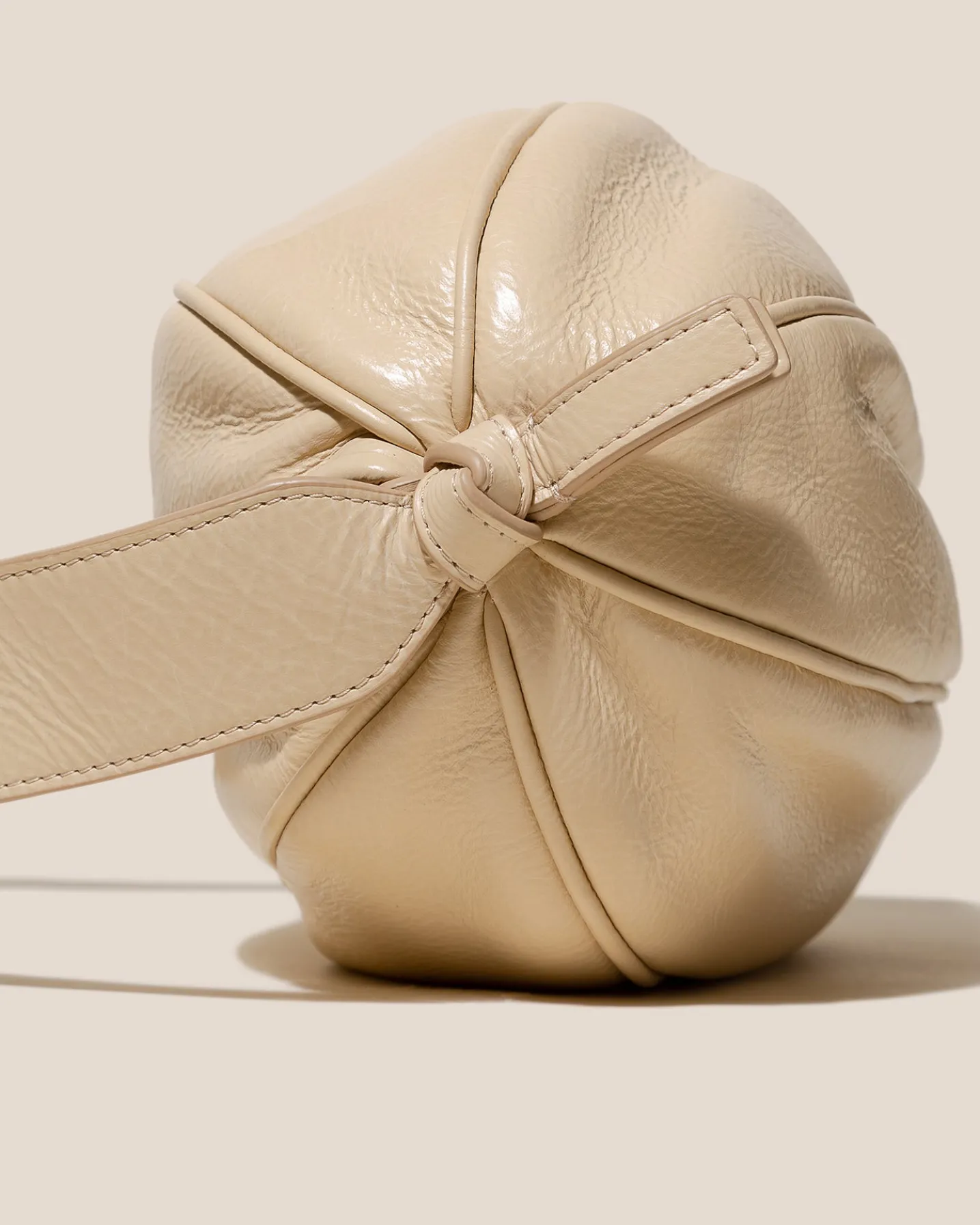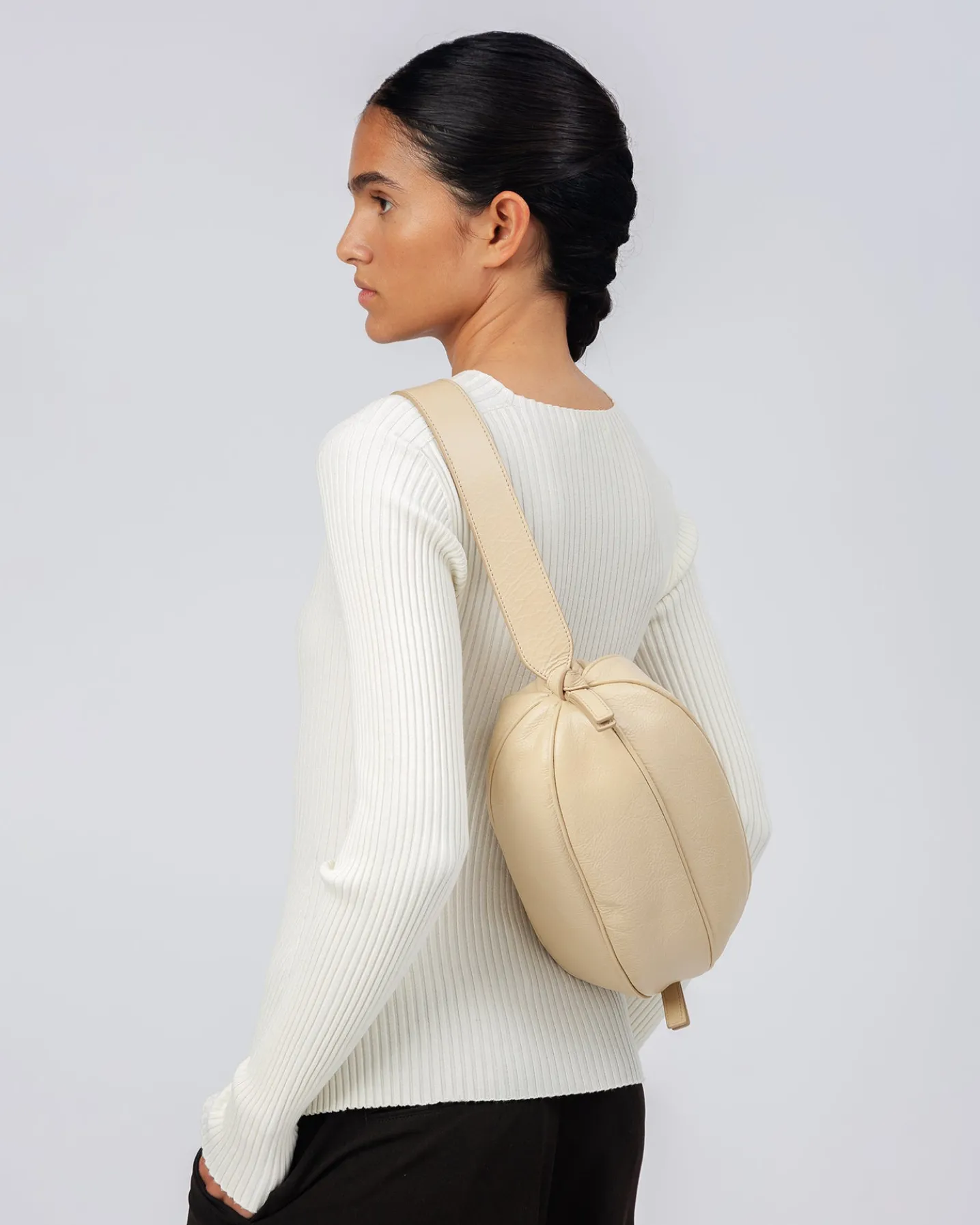 Large elongated ball-shape crossbody bag with knotted side details. Crafted in distressed calf leather and lined with organic cotton canvas.
