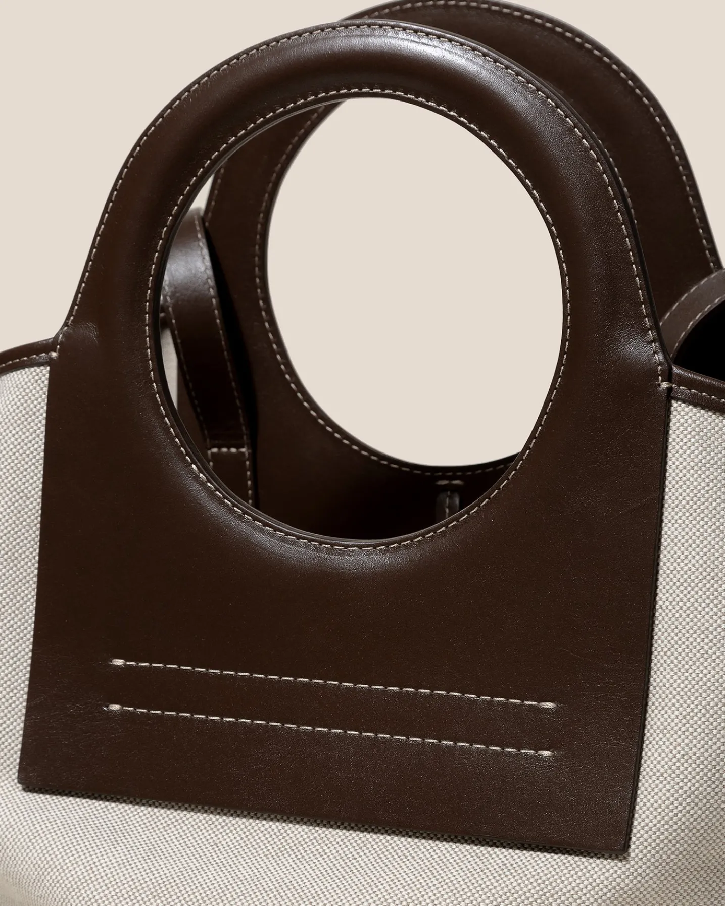 Tote bag constructed from premium ecru canvas with leather handles and trims, lined with natural cotton canvas.