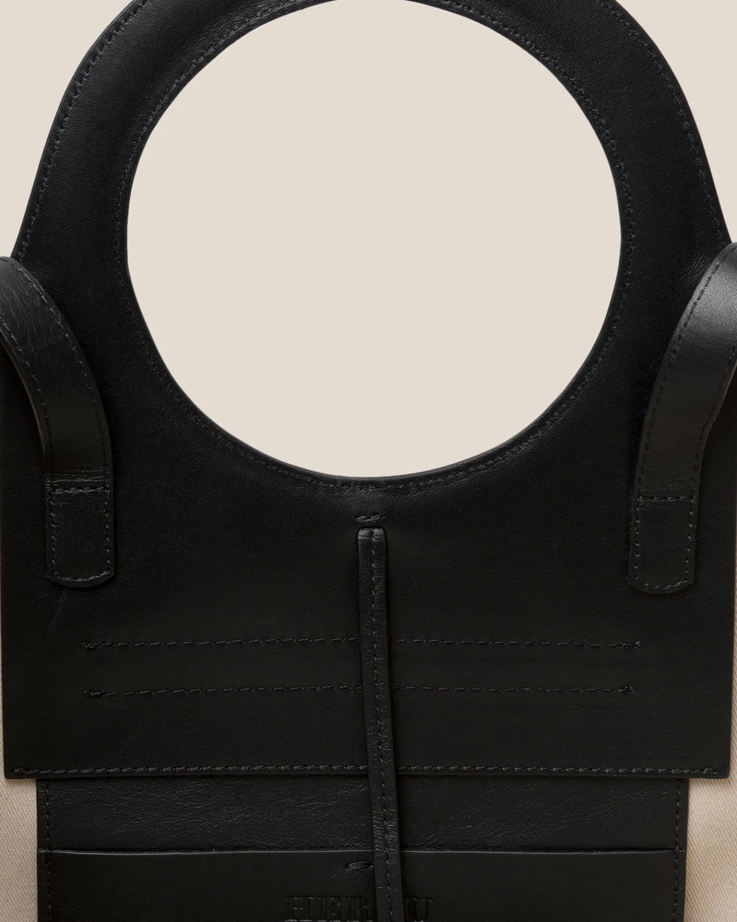 Tote bag constructed from premium ecru canvas with leather handles and trims, lined with natural cotton canvas.