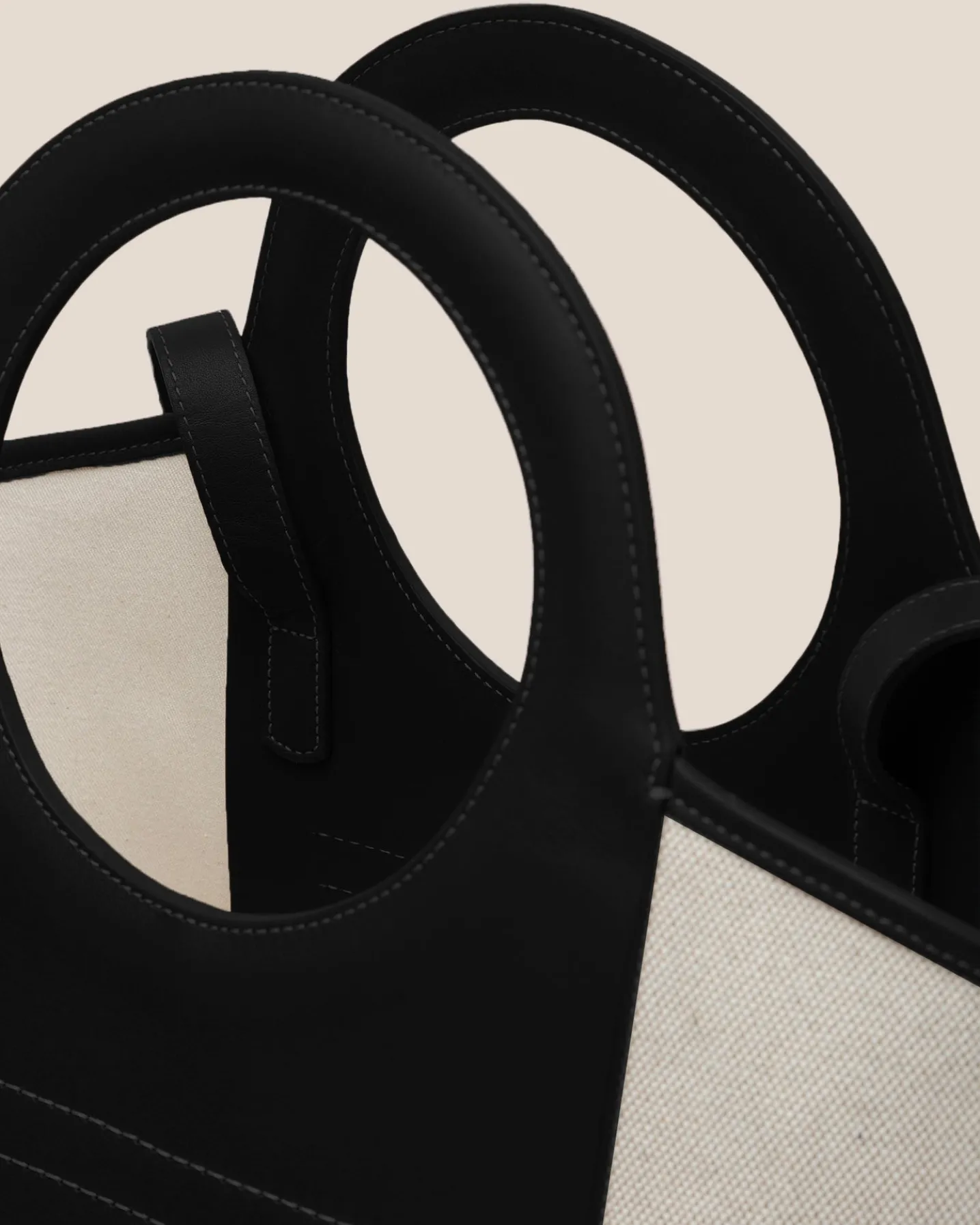 Tote bag constructed from organic textured premium canvas and trimmed with calf leather.