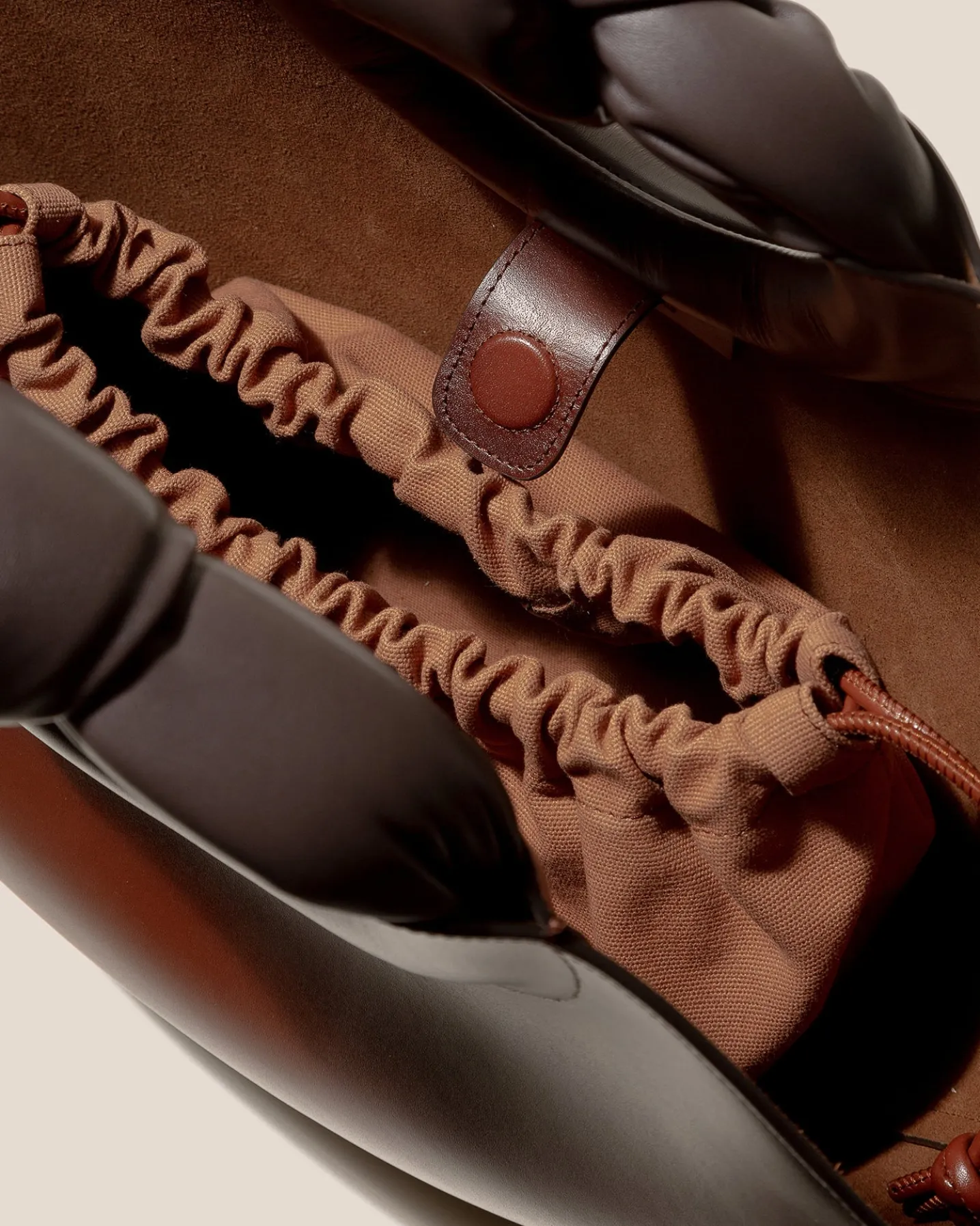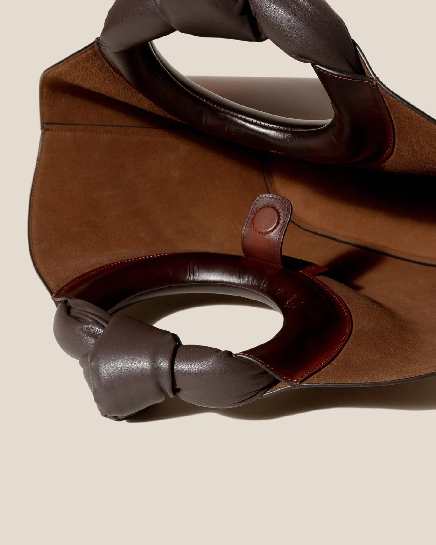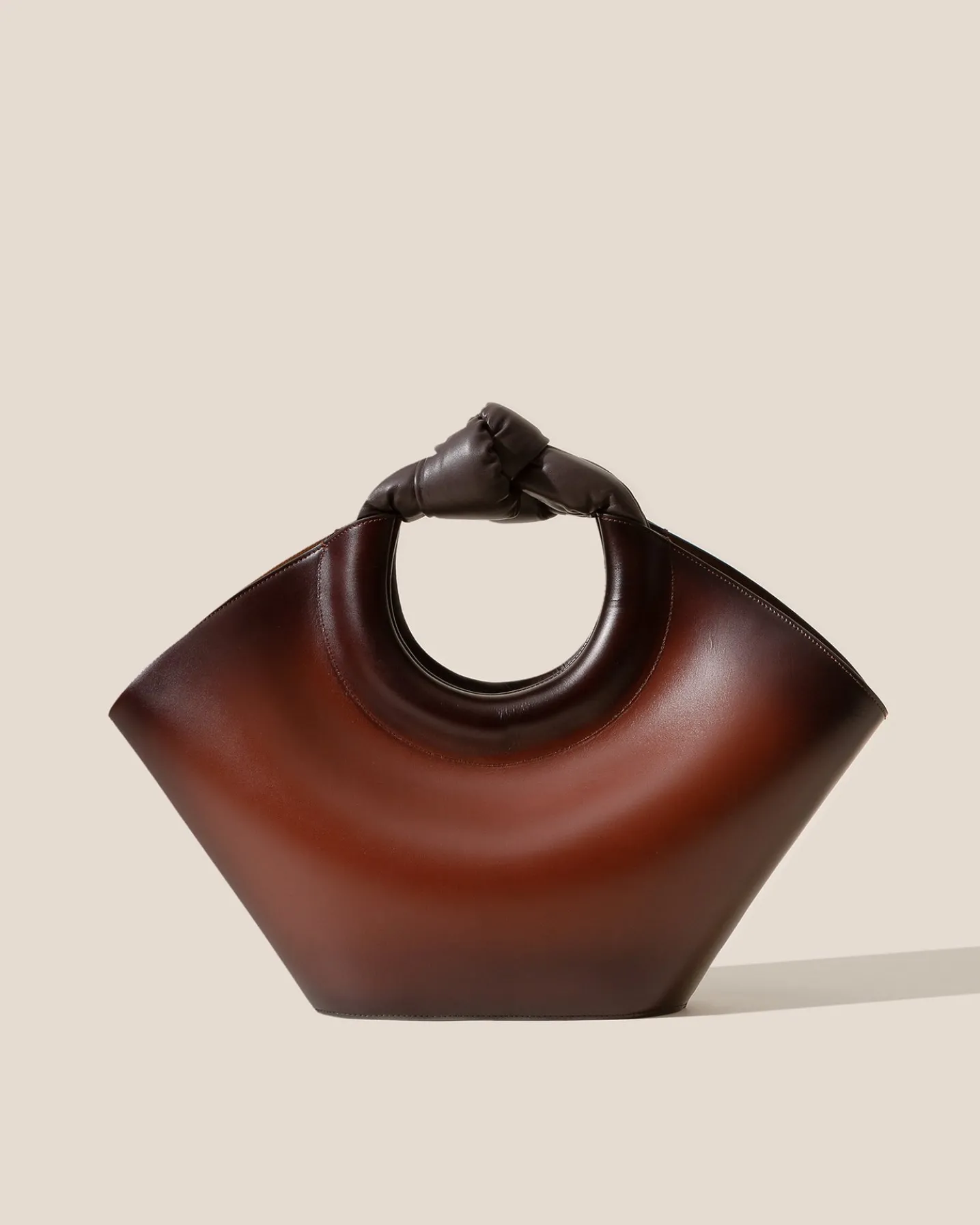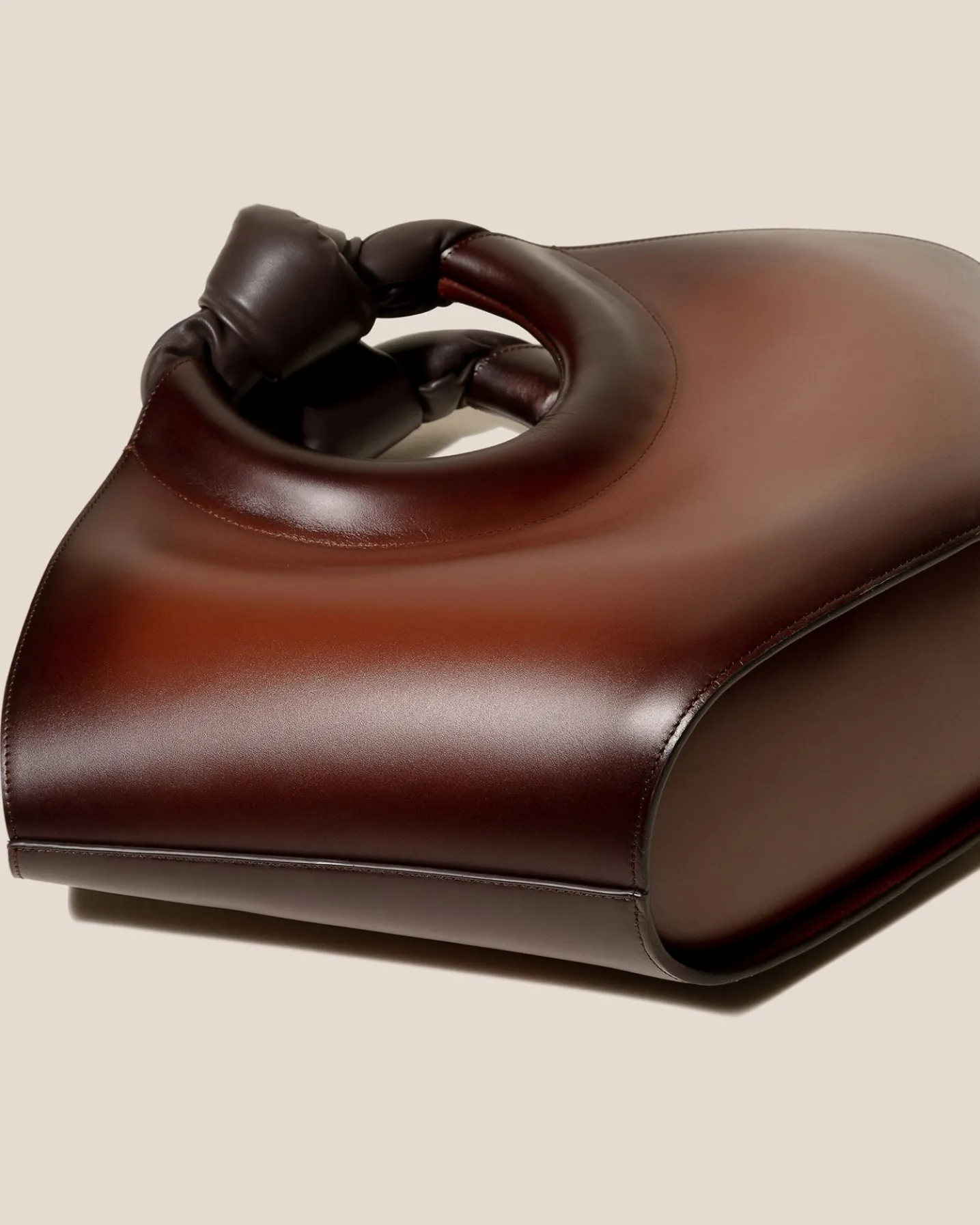 Knotted-handle basket tote crafted in sleek calf leather with airbrushed details.