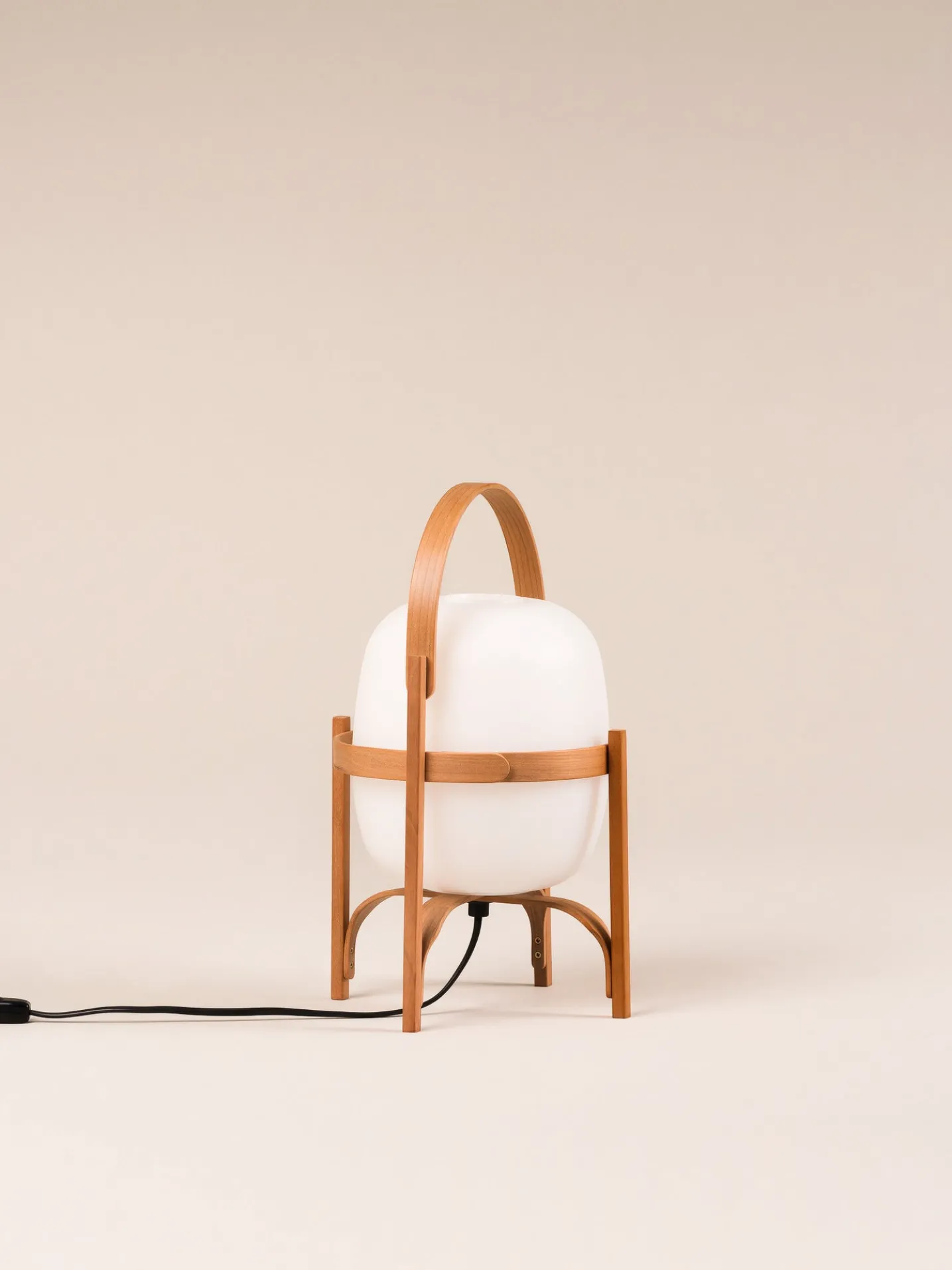Table-Toplamp by Santa & Cole. The smaller version of the Cesta lamp is defined by a smaller wooden structure, always carefully polished and strongly assembled, holding the small opal glass globe in which its light is wrapped.