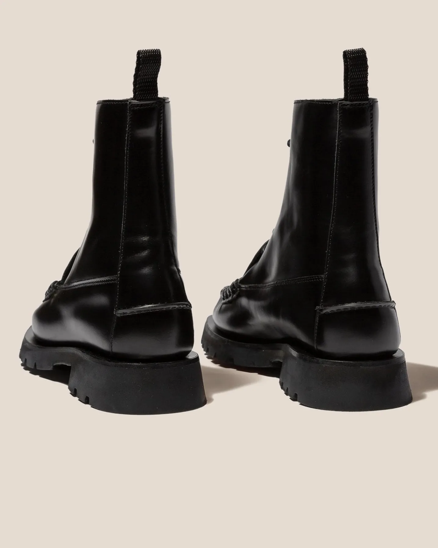 Tread sole lace-up loafer boot crafted in Spanish full-grain calf leather. The upper has been hand sewn using the traditional moccasin construction.