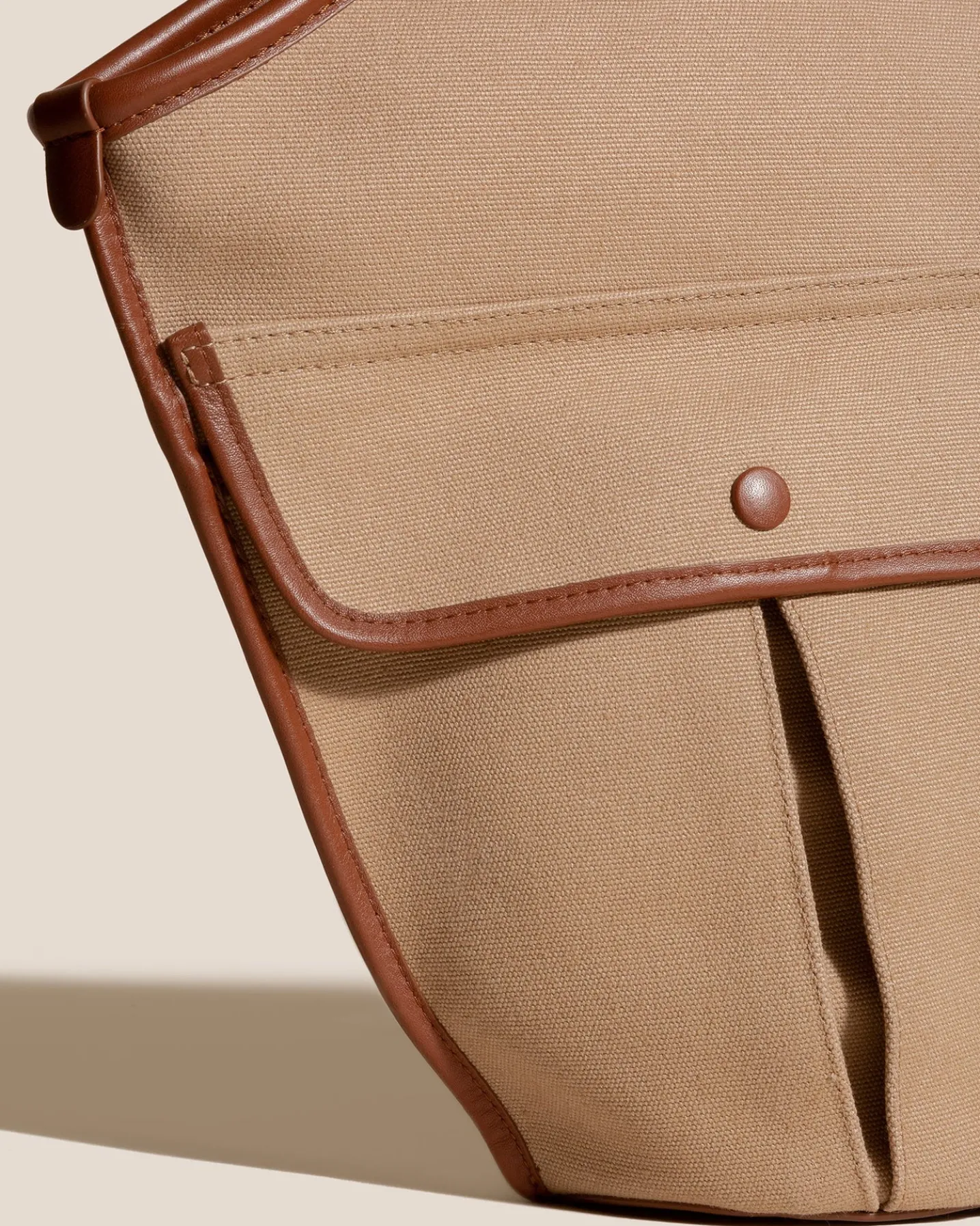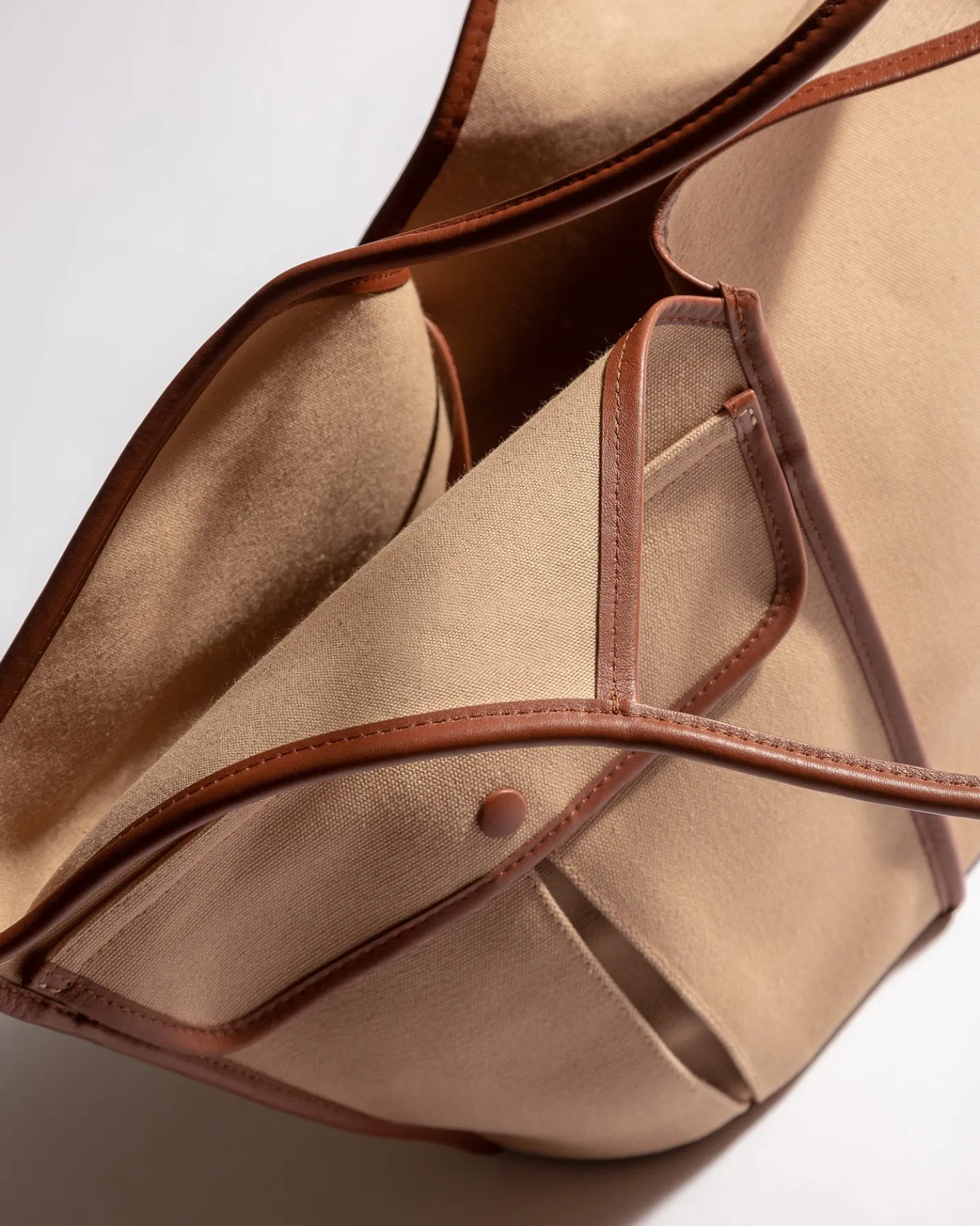 Side-pocket organic cotton tote bag edged with smooth leather. It has a zipped pouch to secure small essentials and slim top handles that sit over the shoulder.