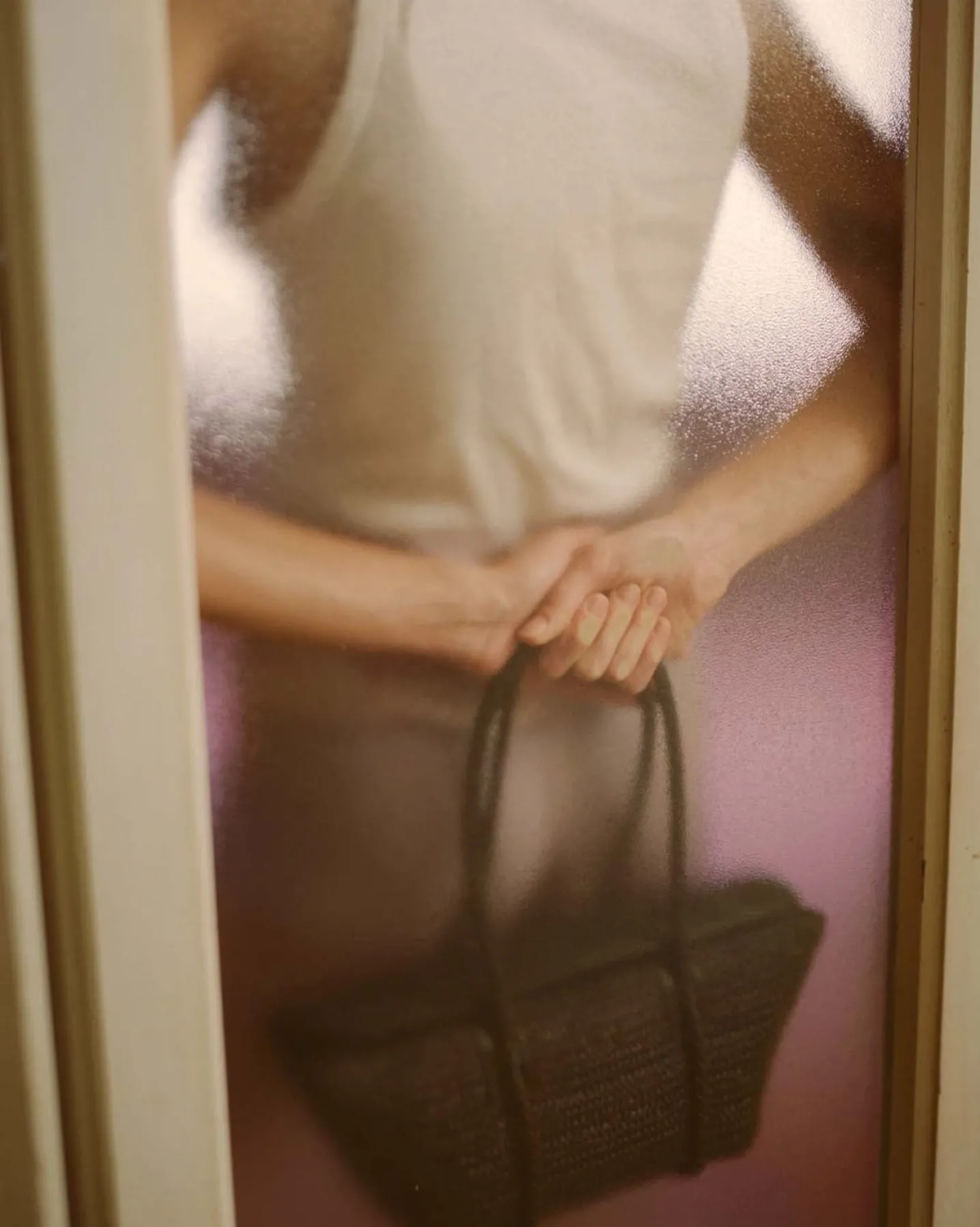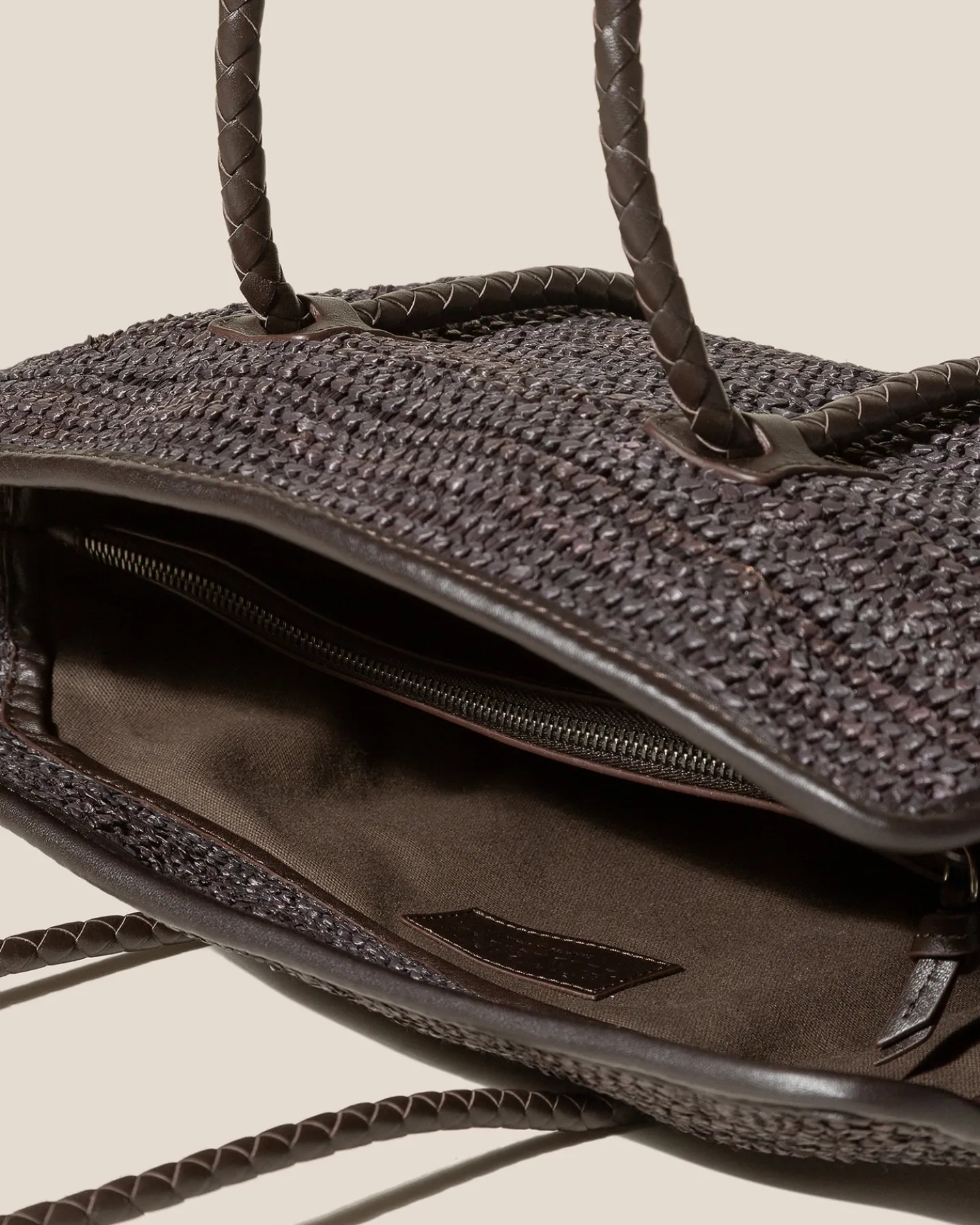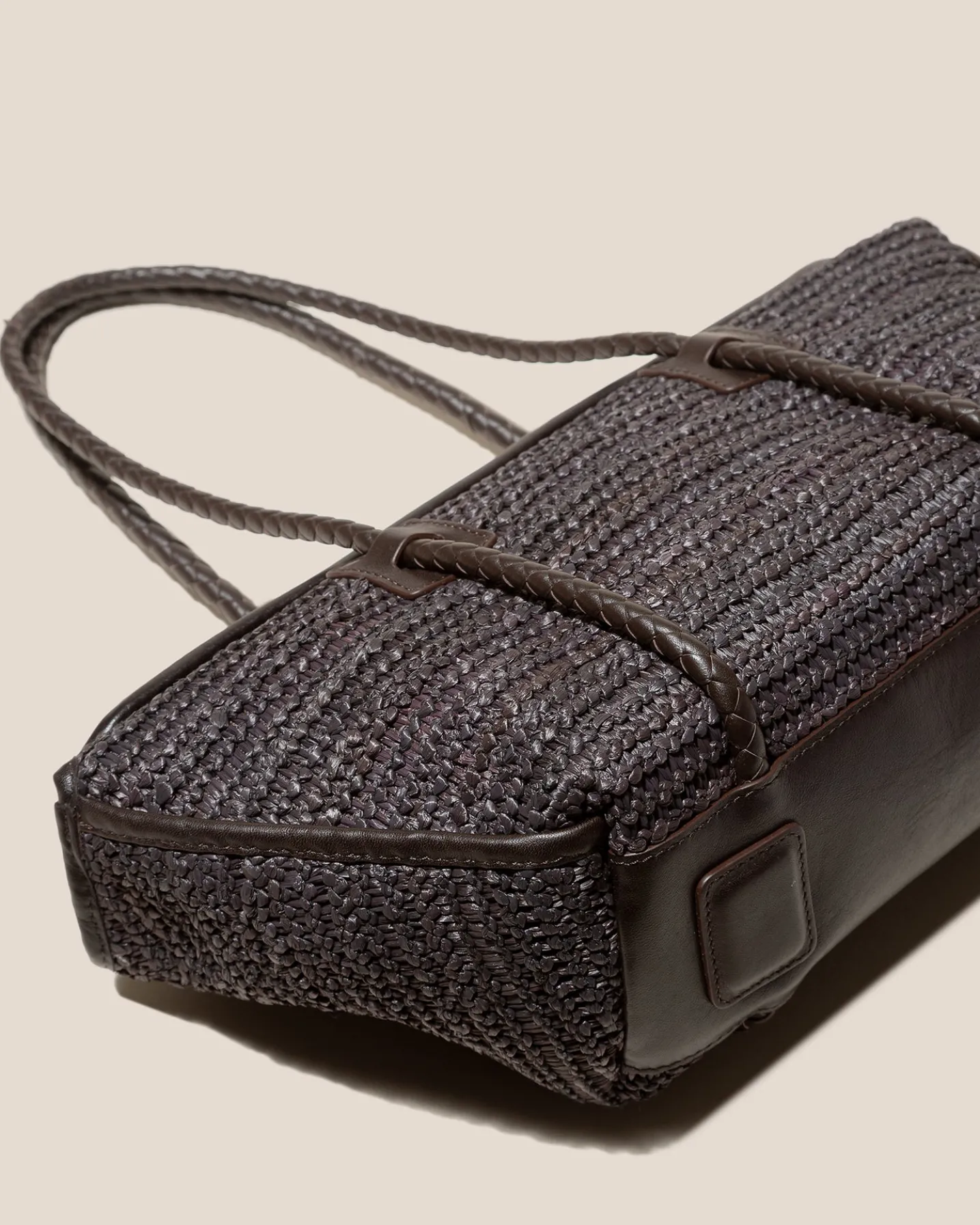 Leather framed raffia shoulder bag crafted in natural raffia.
