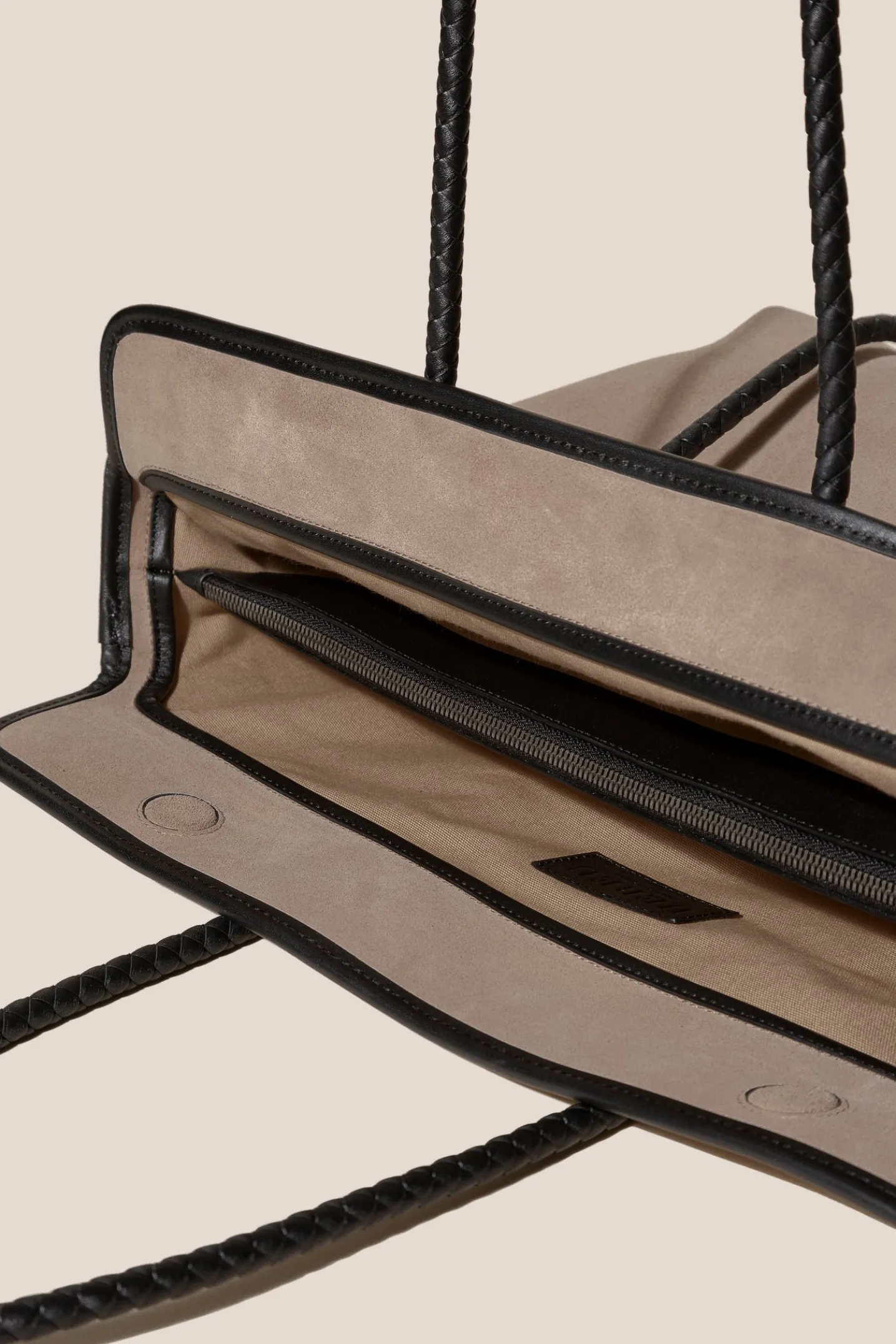 Leather framed tote crafted in calf suede and smooth soft calf leather.