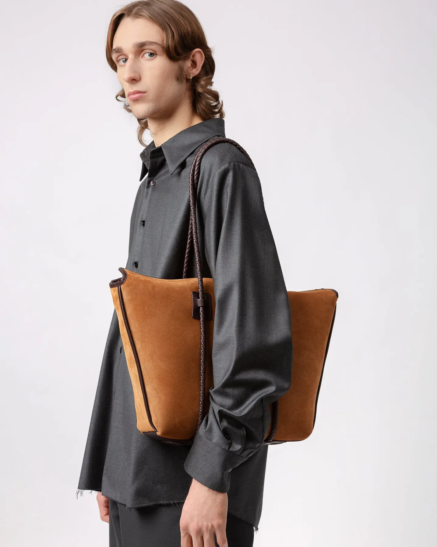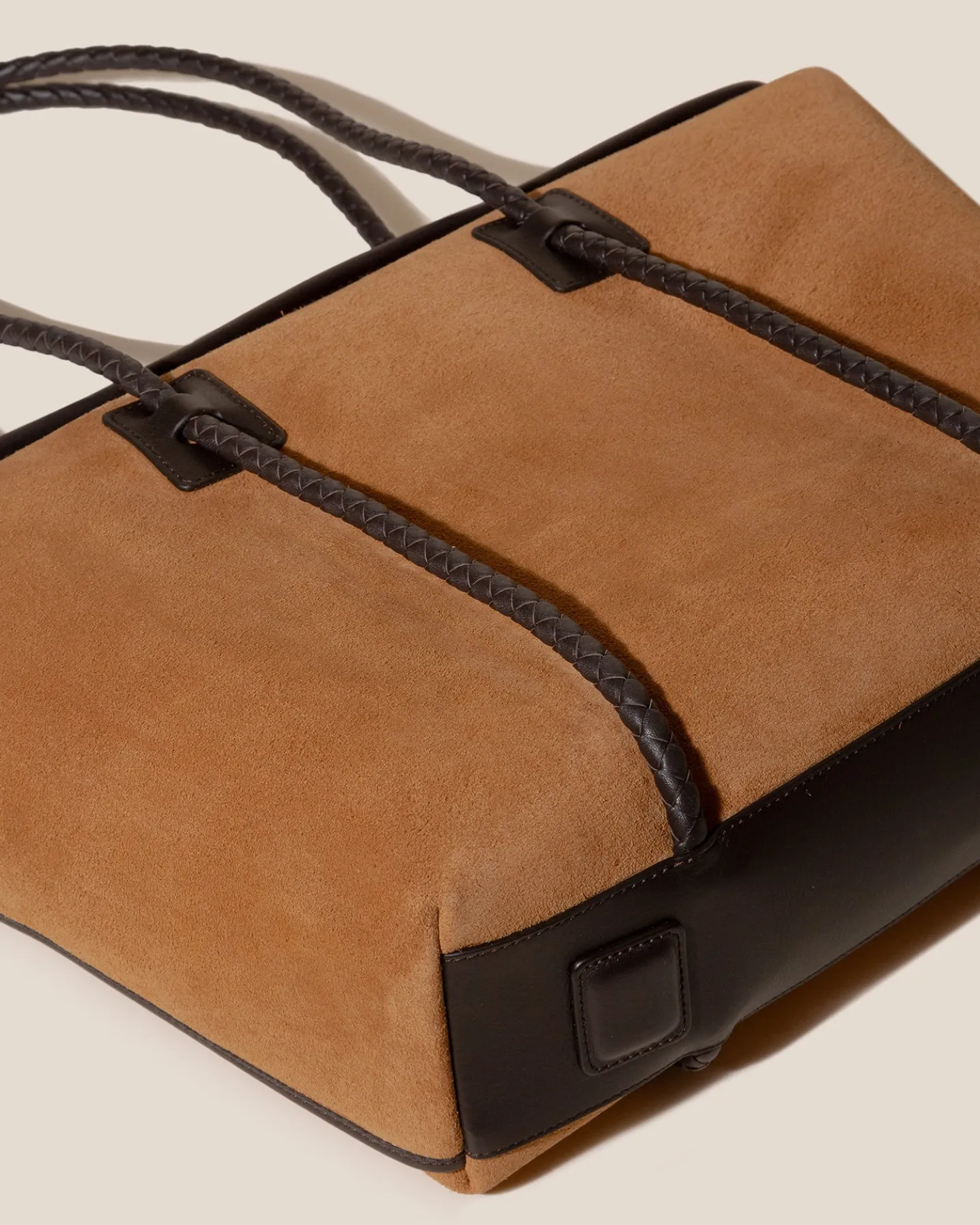 Leather framed tote crafted in calf suede and smooth soft calf leather.