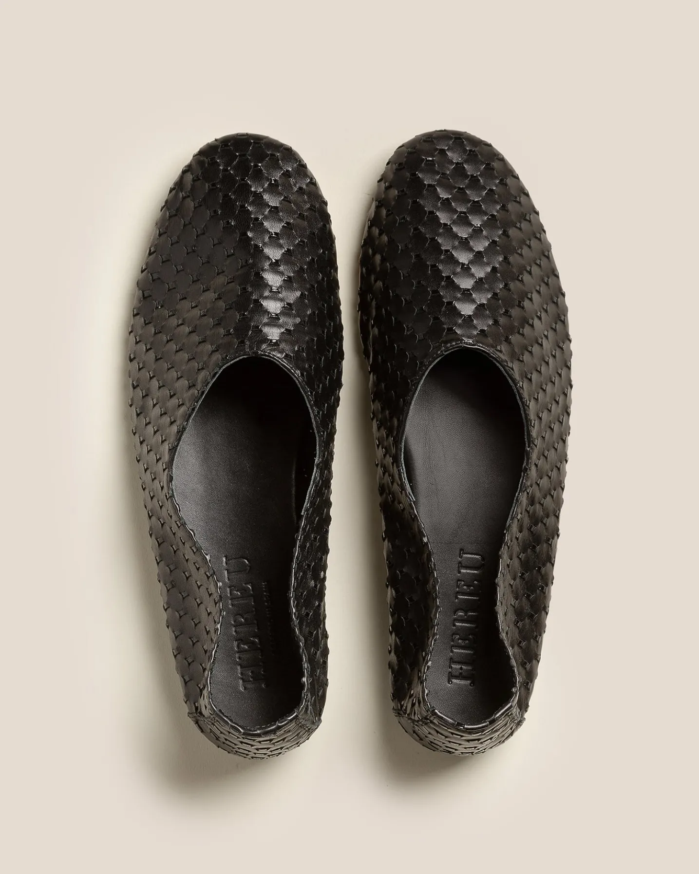 High cut deconstructed loafer crafted in interlaced goat leather andlambskin.