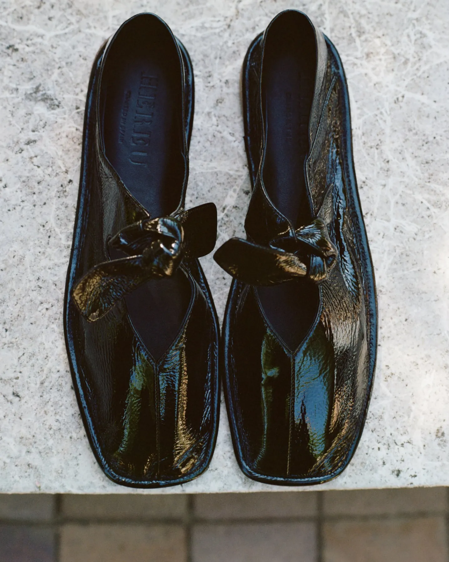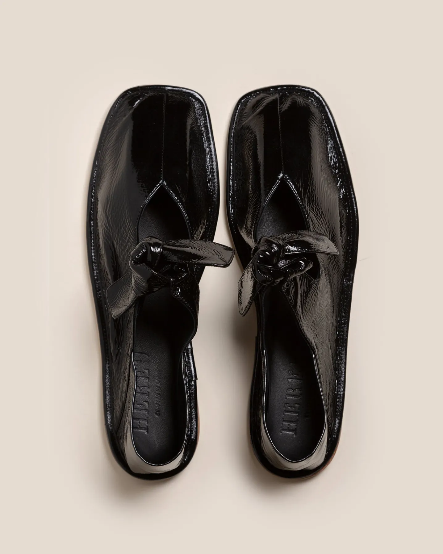 Square toe pump with bow detail, crafted in crinkled glossy lambskin.