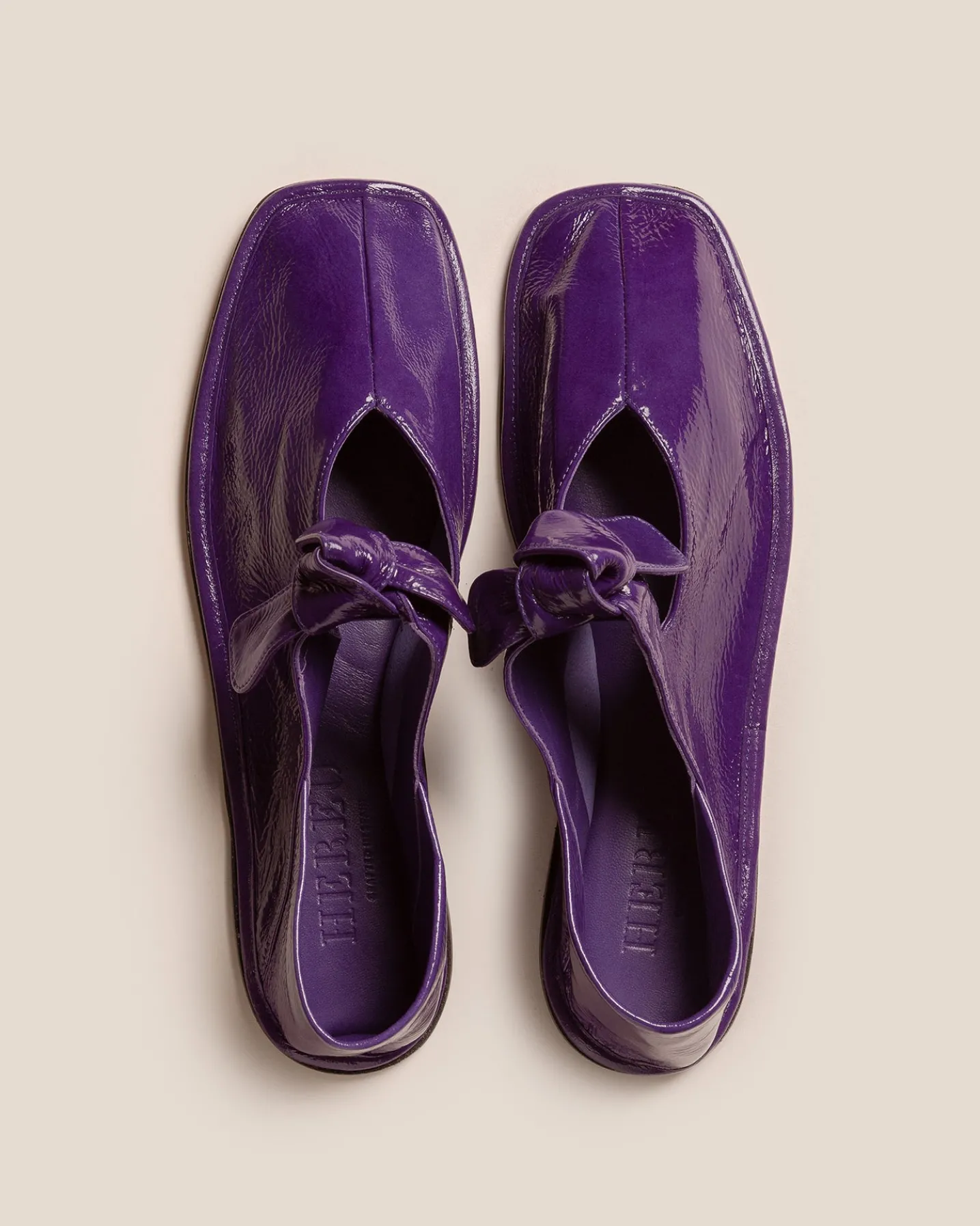 Square toe pump with bow detail, crafted in crinkled glossy lambskin.