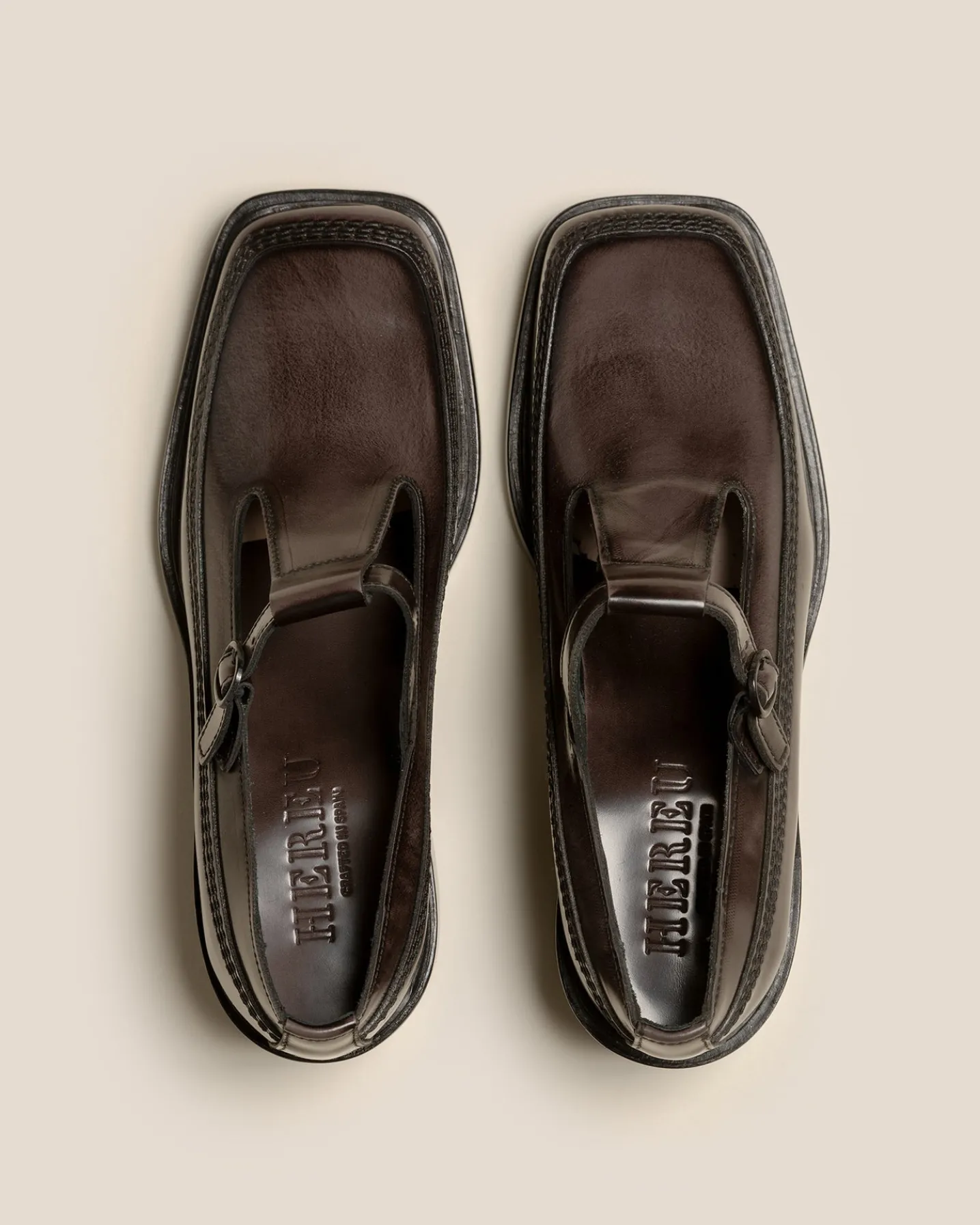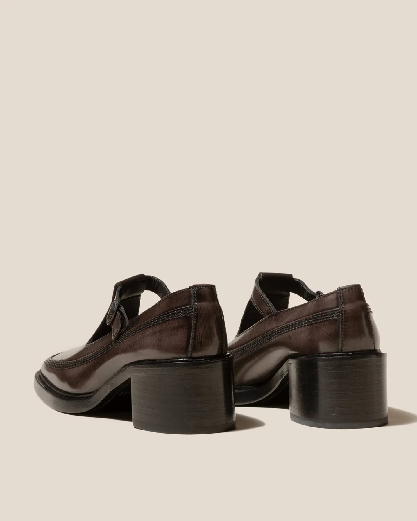 T-Bar heeled loafer crafted in Spanish brushed leather.