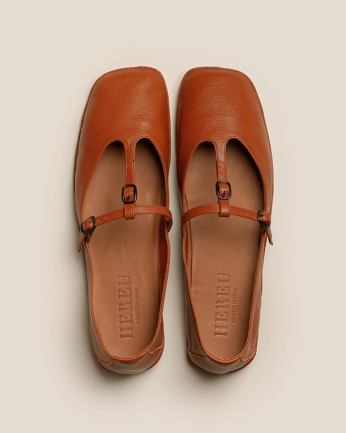 Soft T-bar with buckle detail, crafted in supple shiny lambskin.