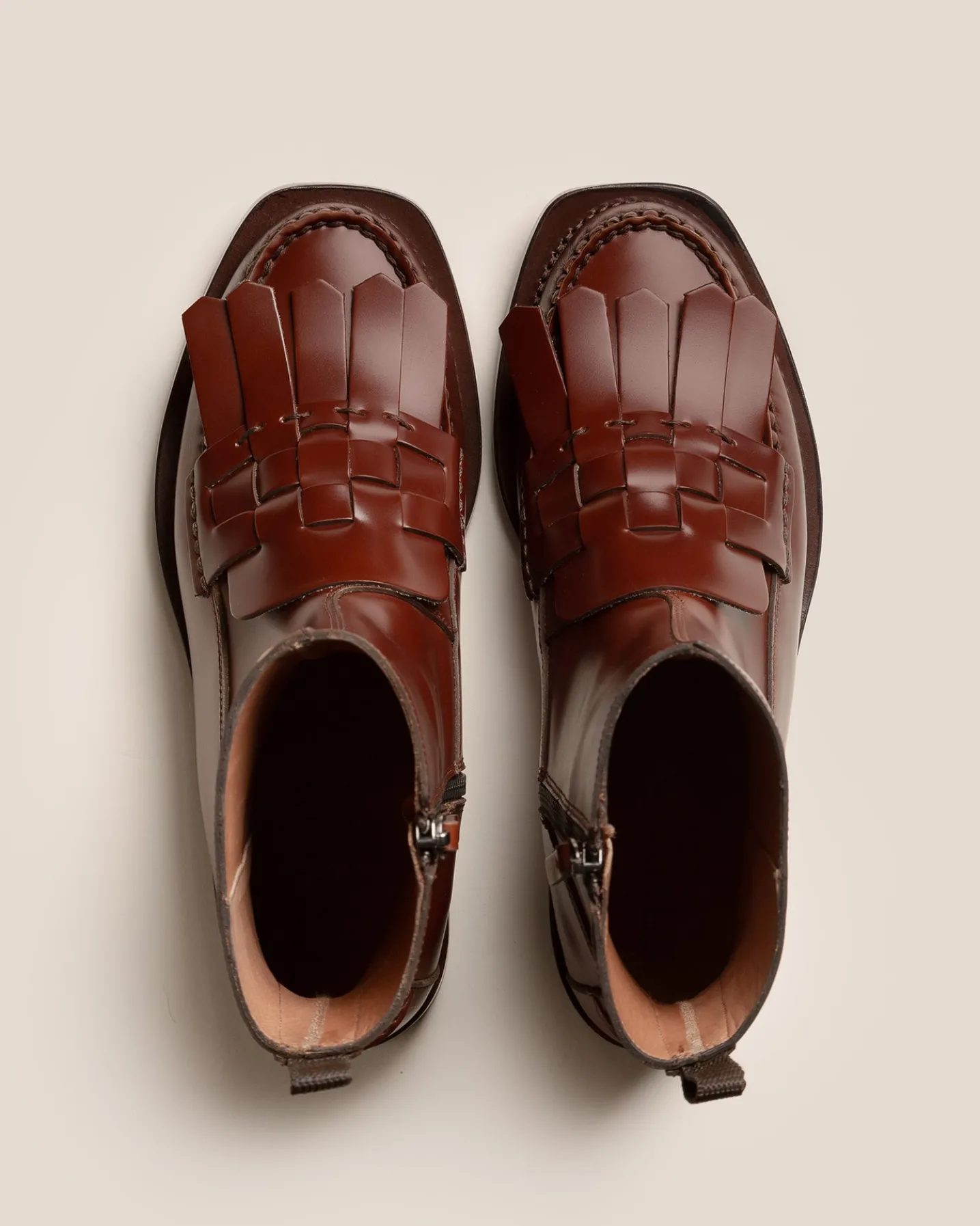 Mid-calf zipped boot with interwoven fringes front detail, crafted in structured calf leather.