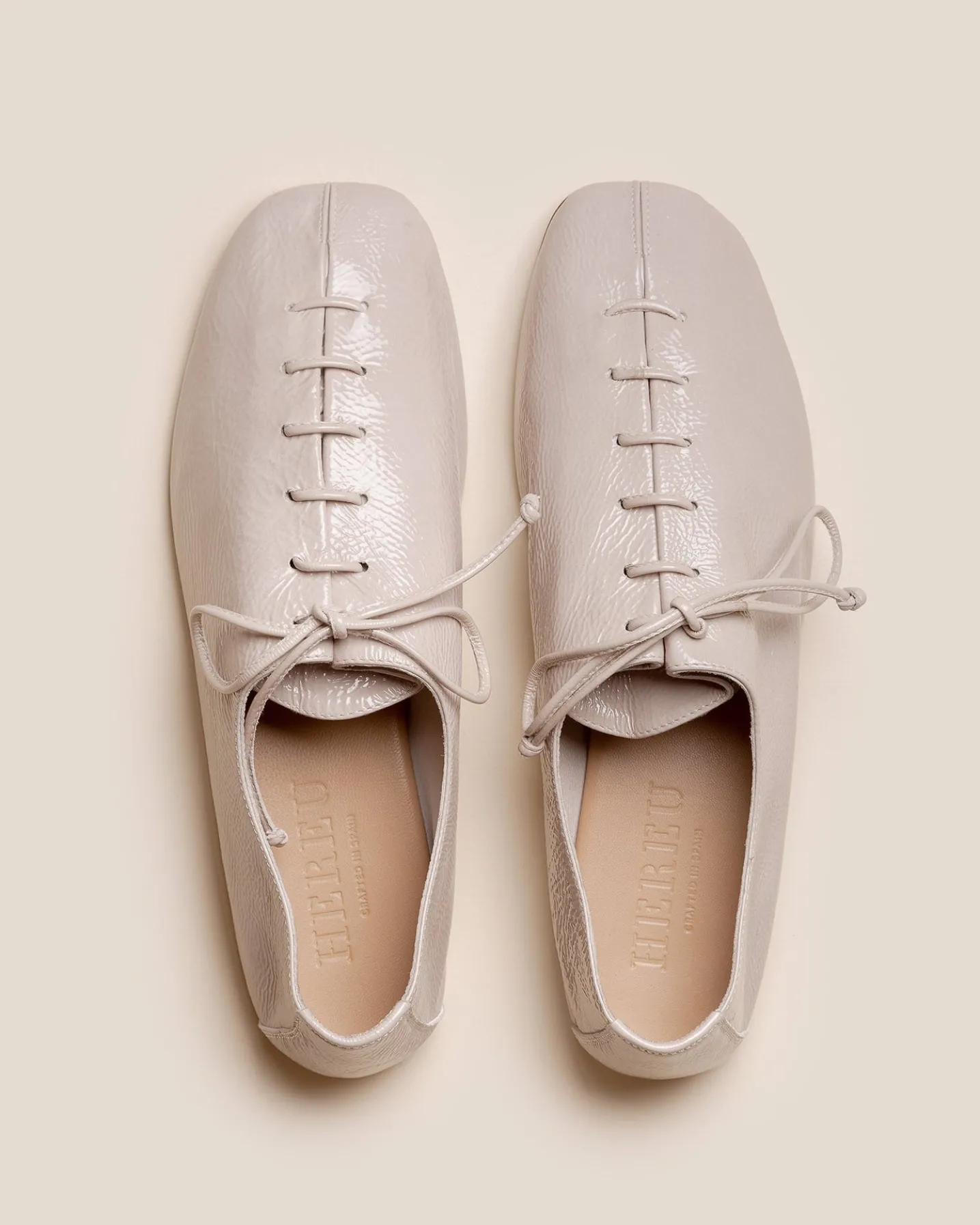 Flat lace-up shoe with bellows tongue, crafted in unlined Italian crinkled glossy lambskin.