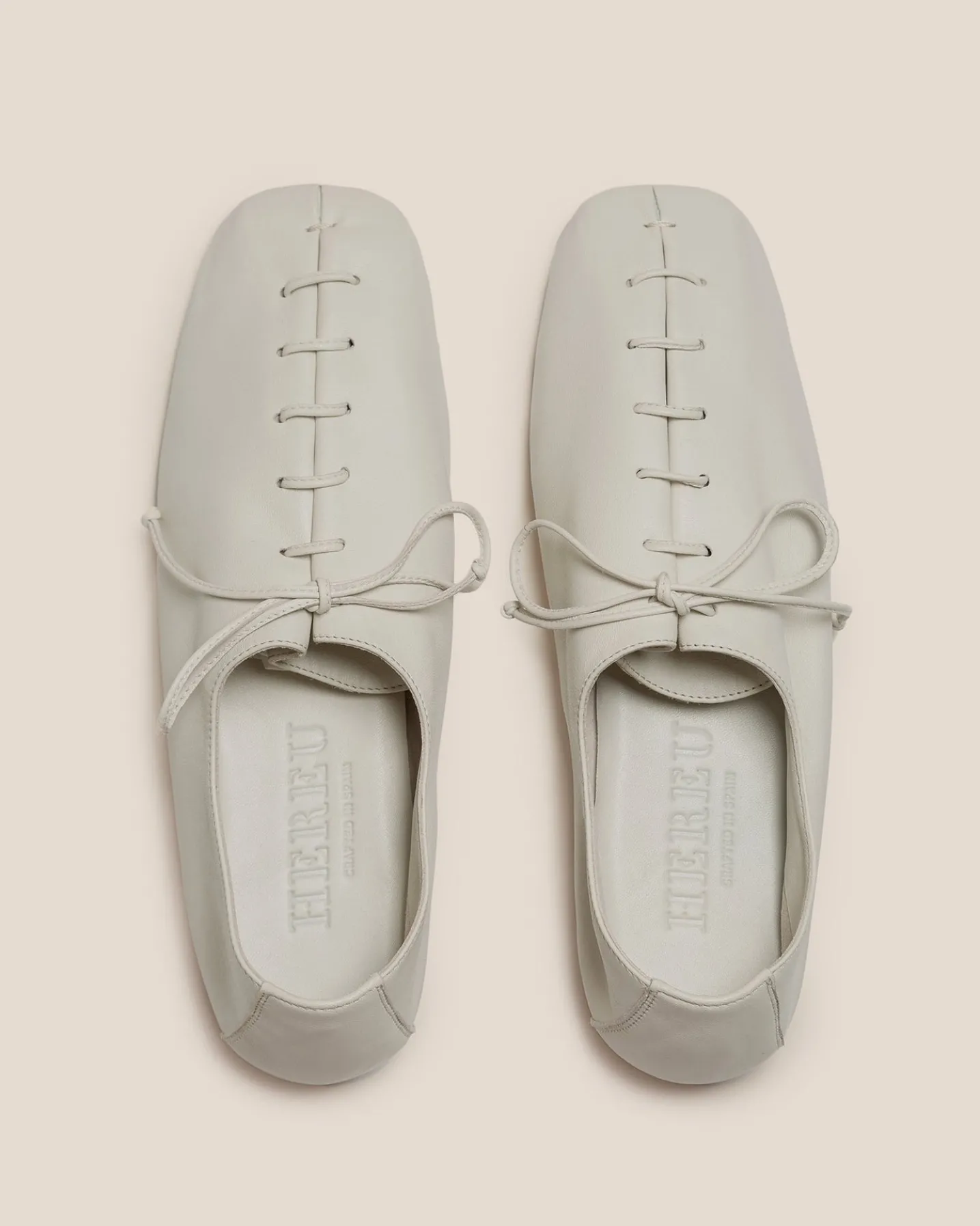 Round-toe flat lace-up shoe with bellows tongue (one piece). Crafted in soft calf leather with matching leather laces.