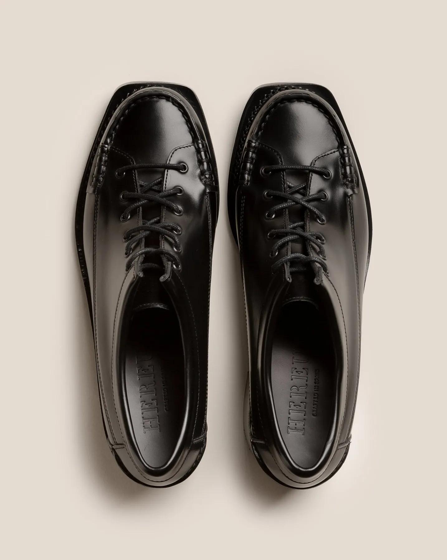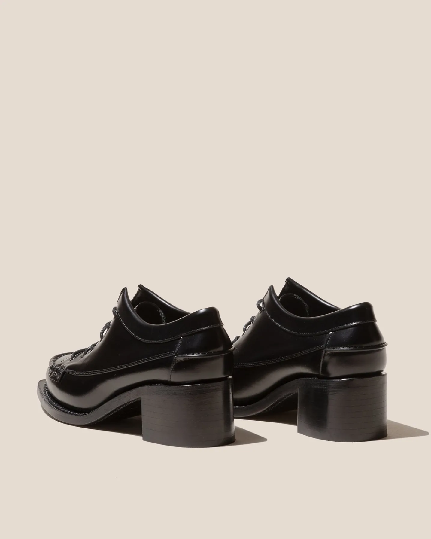 Heeled lace-to-toe moccasin crafted in structured calf leather. The outsole is stitched to the upper for extra flexibility and durability.