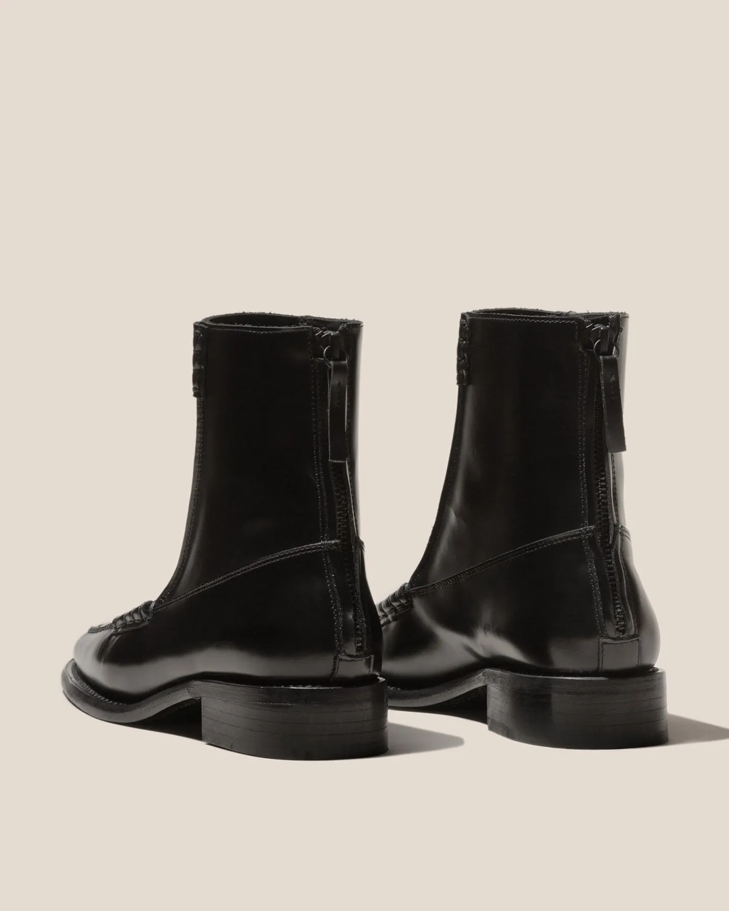 Square toe low calf zipped boot crafted in Spanish calf leather and calf leather lining. Hand-sewn using the traditional moccasin construction. The outsole is stitched to the upper for extra flexibility and durability.