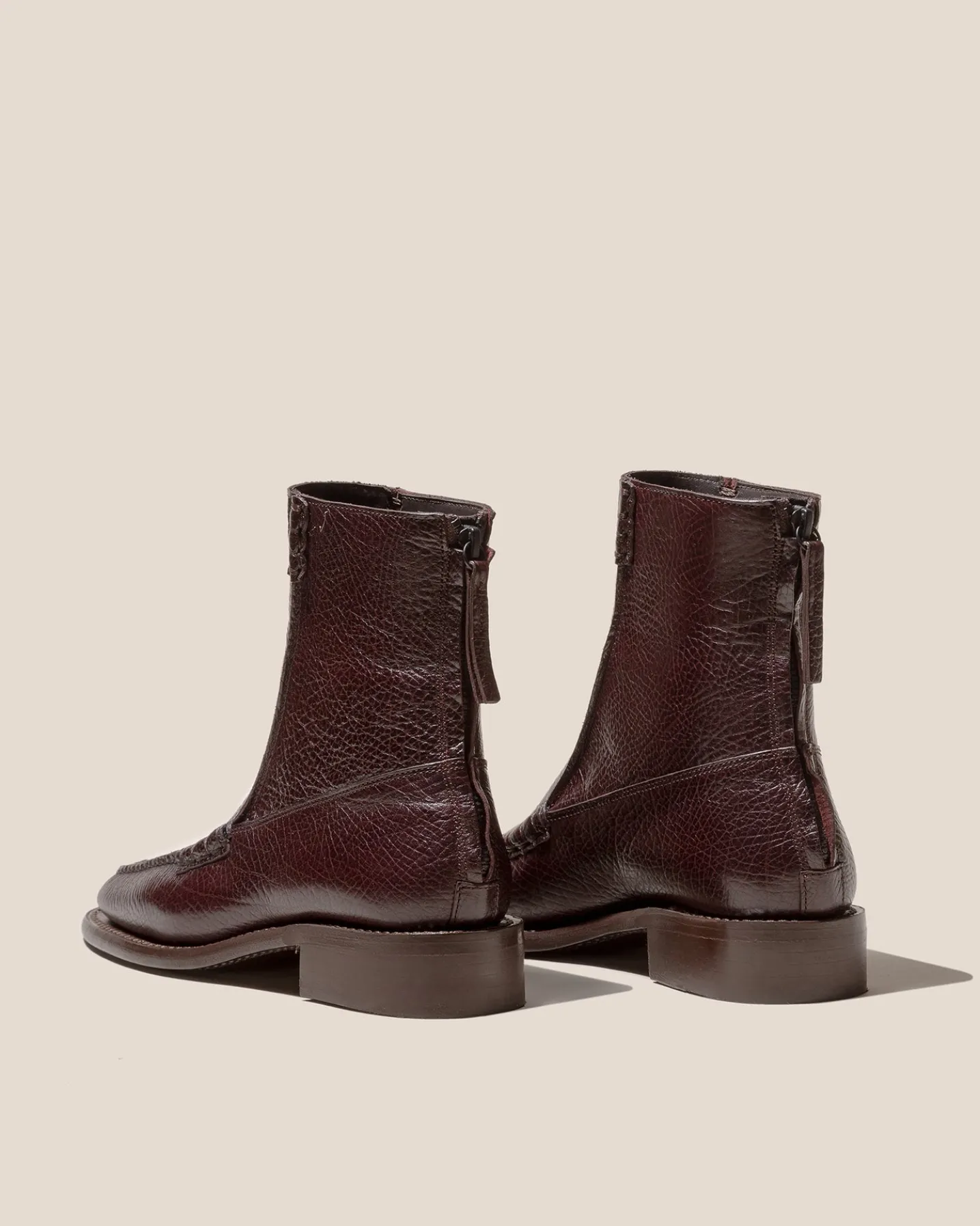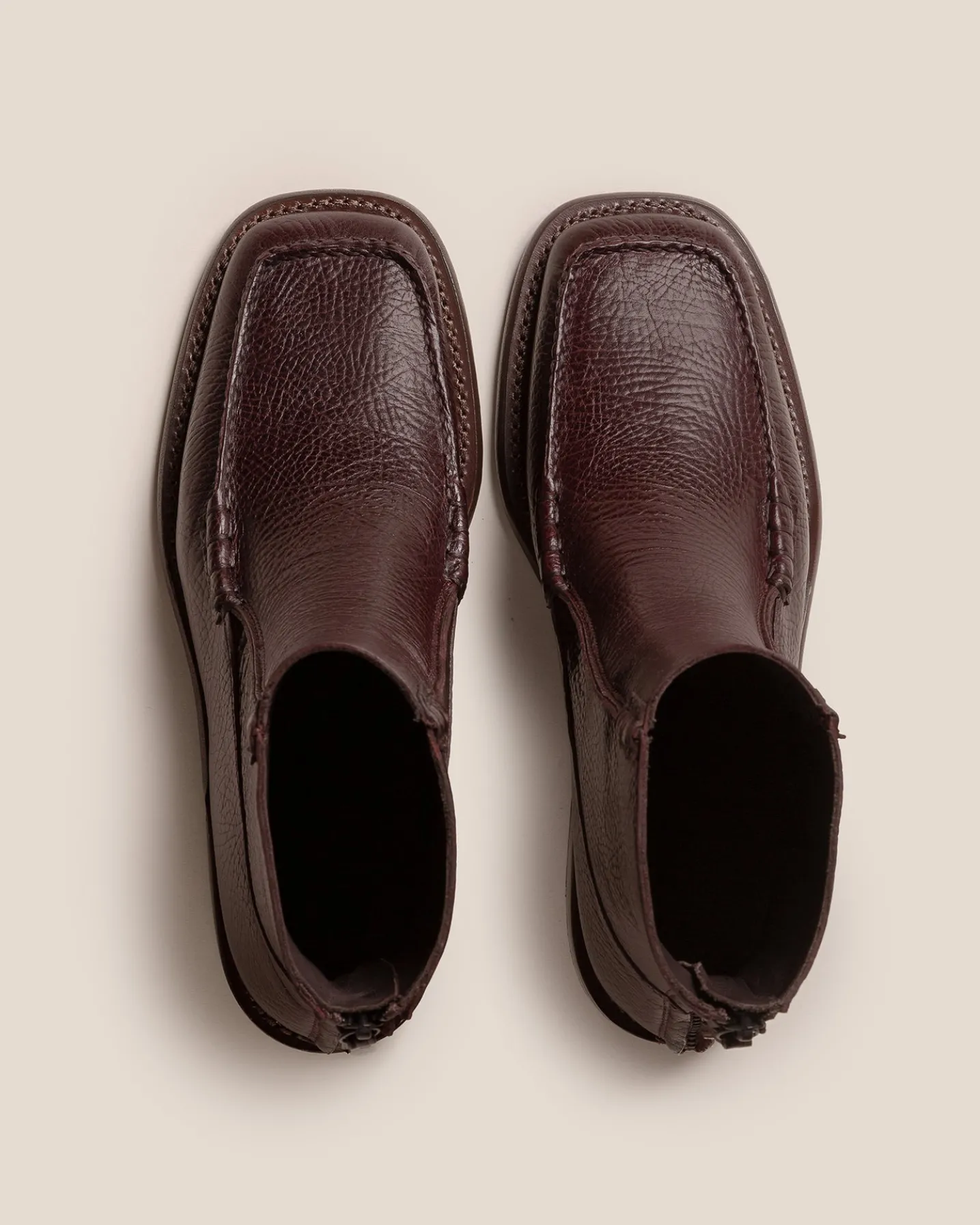 Square toe low calf zipped boot, crafted in tumbled calf leather. Hand sewn using the traditional moccasin construction. The outsole is stitched to the upper for extra flexibility and durability.