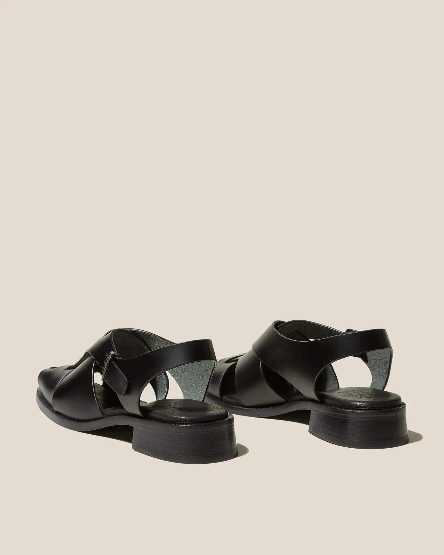 Square-toe asymmetrical fisherman sandal. Crafted in structured leather.