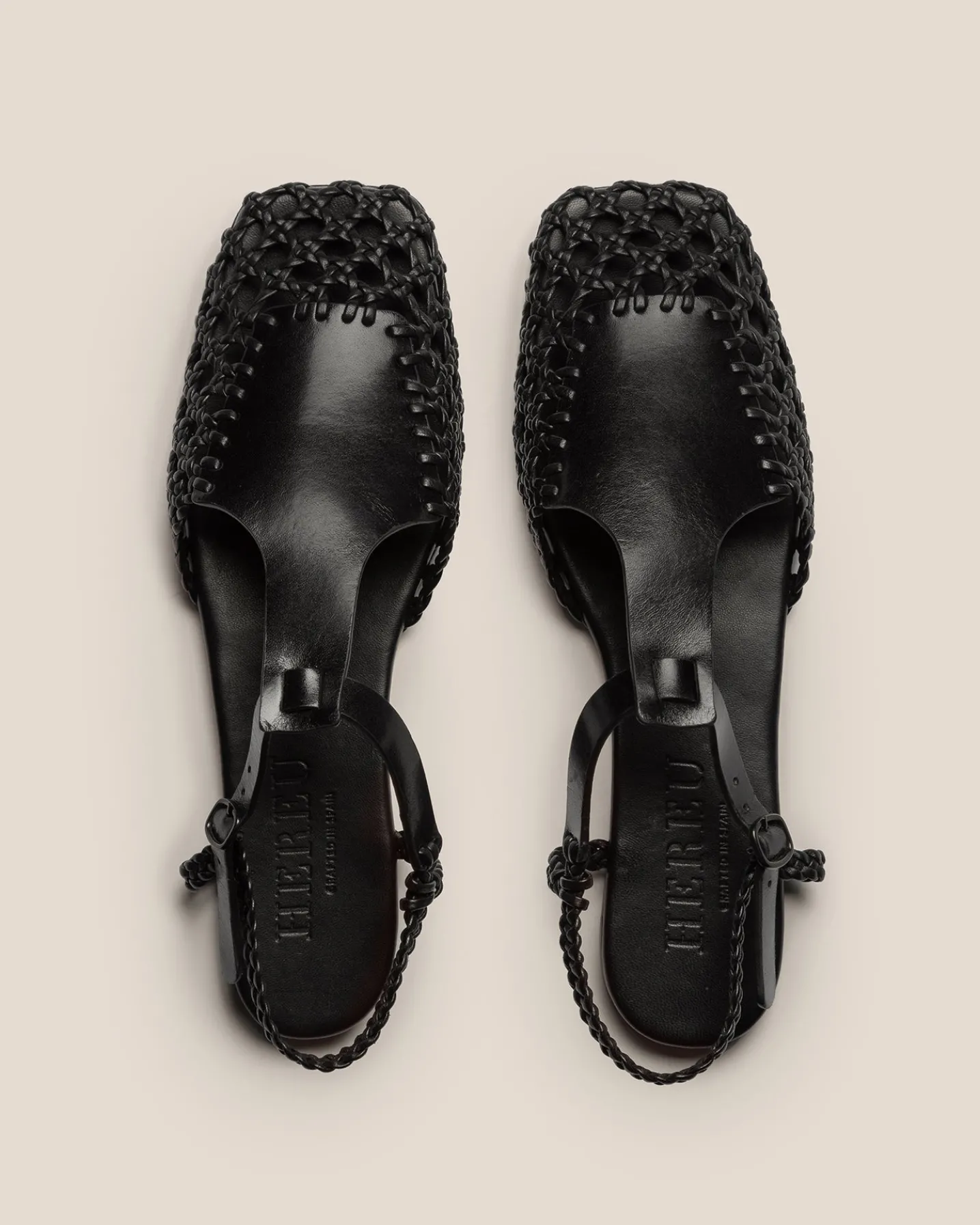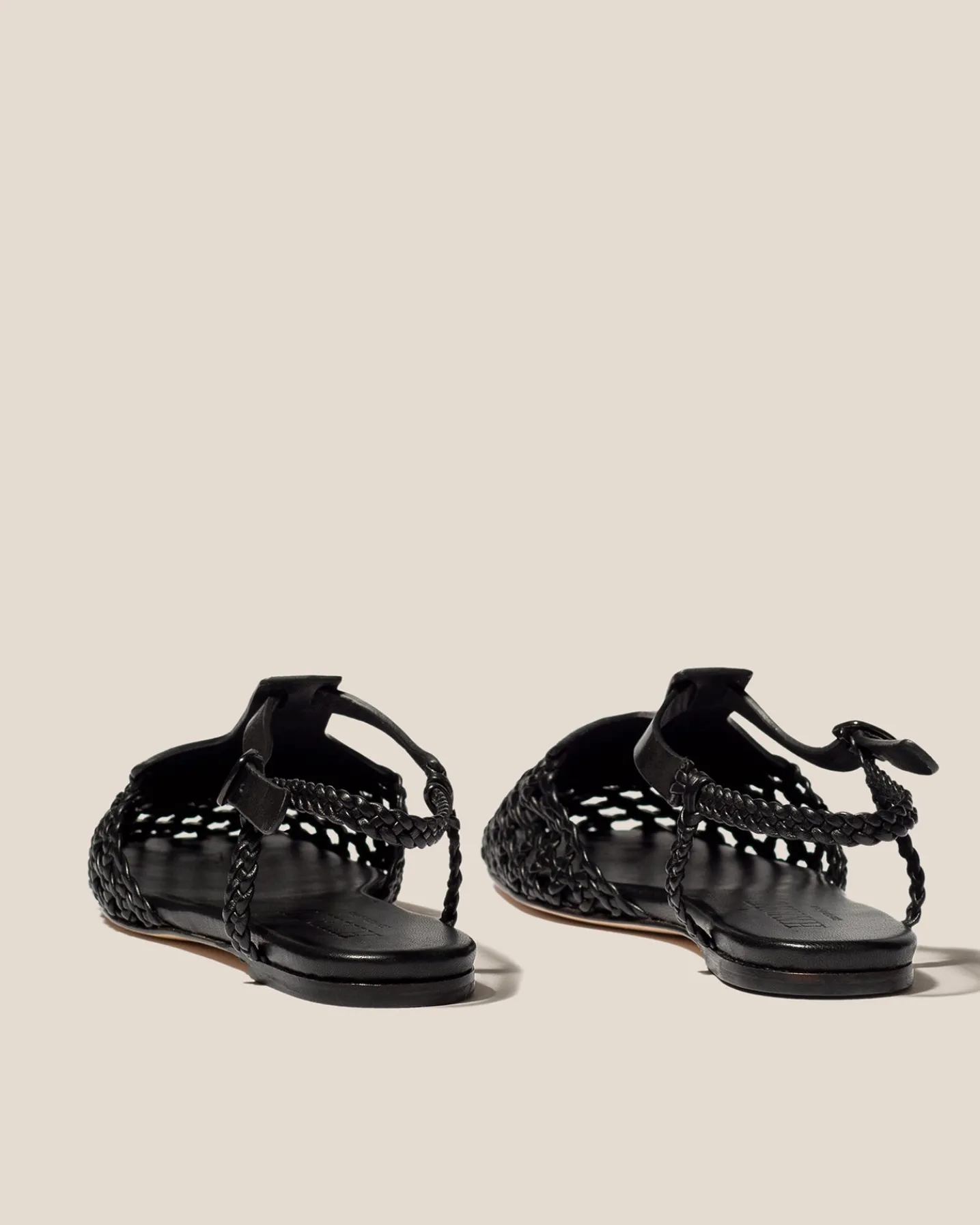 Square toe hand-woven t-bar sandal crafted in a combination of veg-tanned calf leather and supple lambskin.