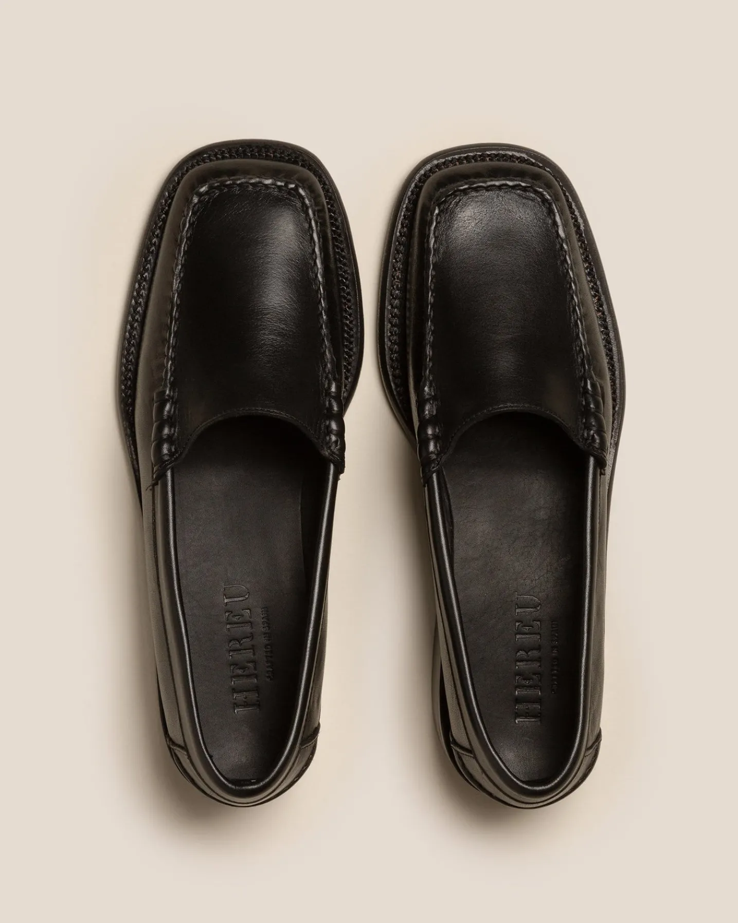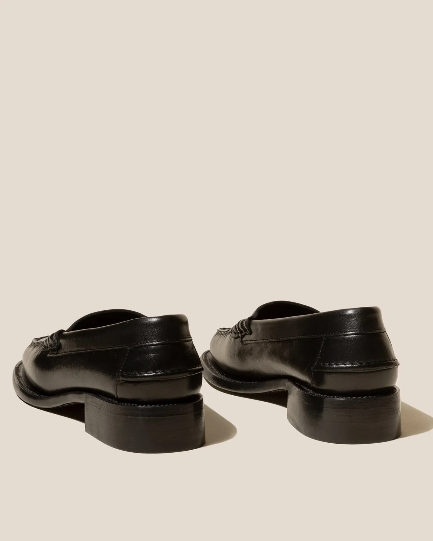Square toe high-cut loafer pump crafted in polished Italian calf leather. Hand-sewn using the traditional moccasin construction. The outsole is stitched to the upper for extra flexibility and durability.