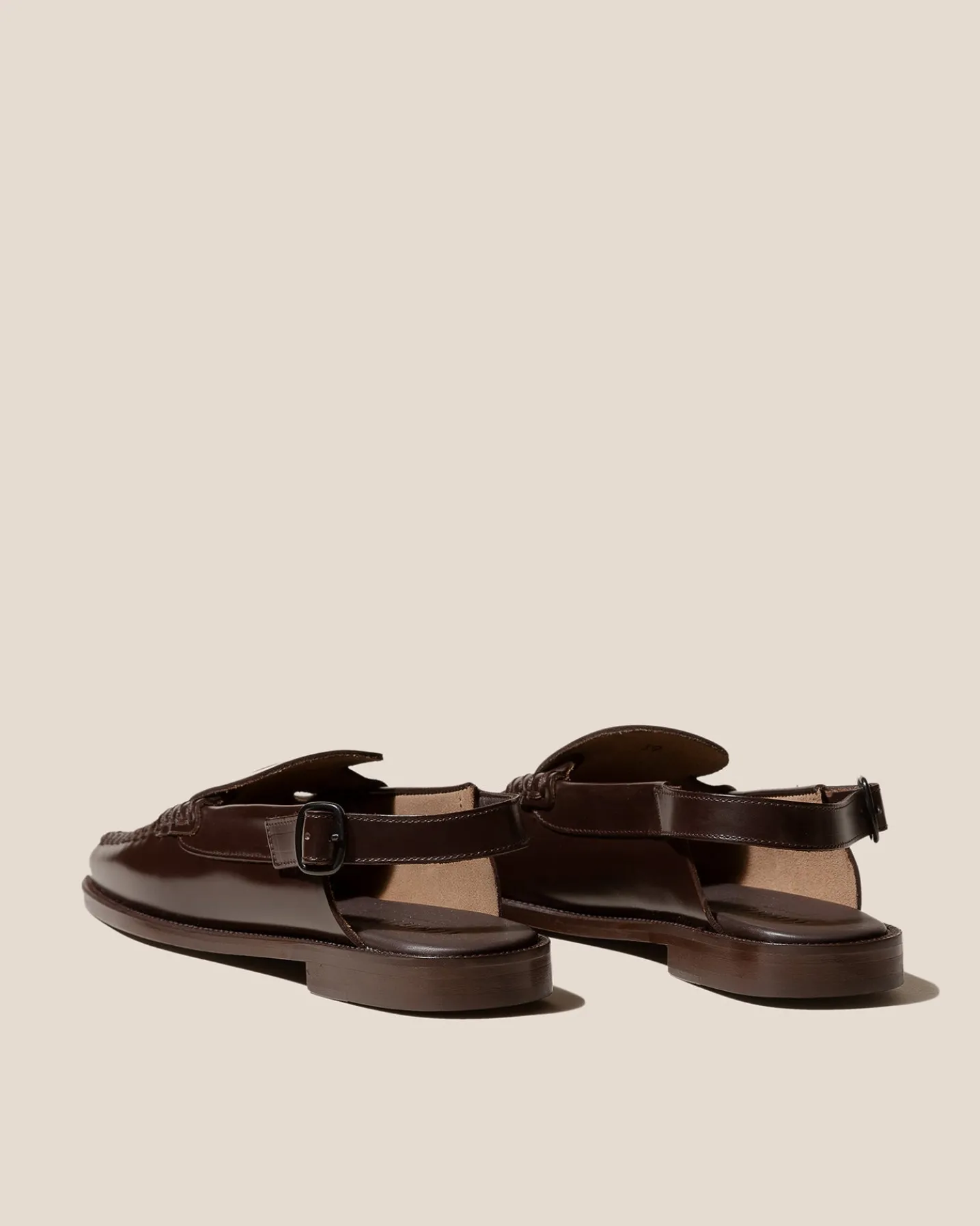 Opened-toe slingbackloafer with interlaced front detail crafted in Spanish structured calf leather.