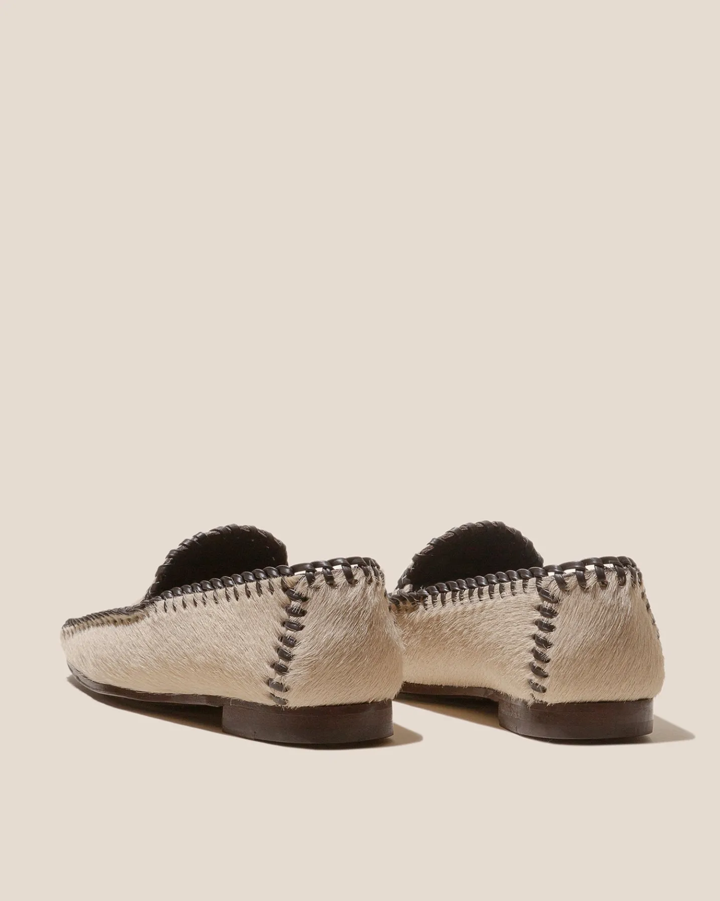 Square toe loafer with braided seams, crafted in calf hair. The outsole is stitched to the upper for extra flexibility and durability.