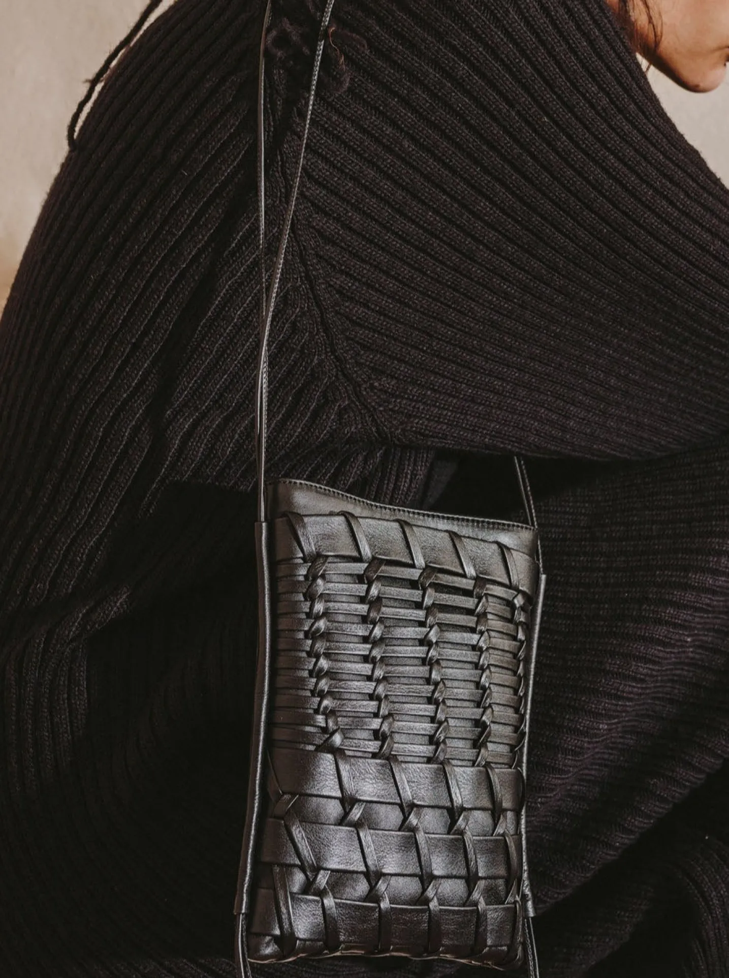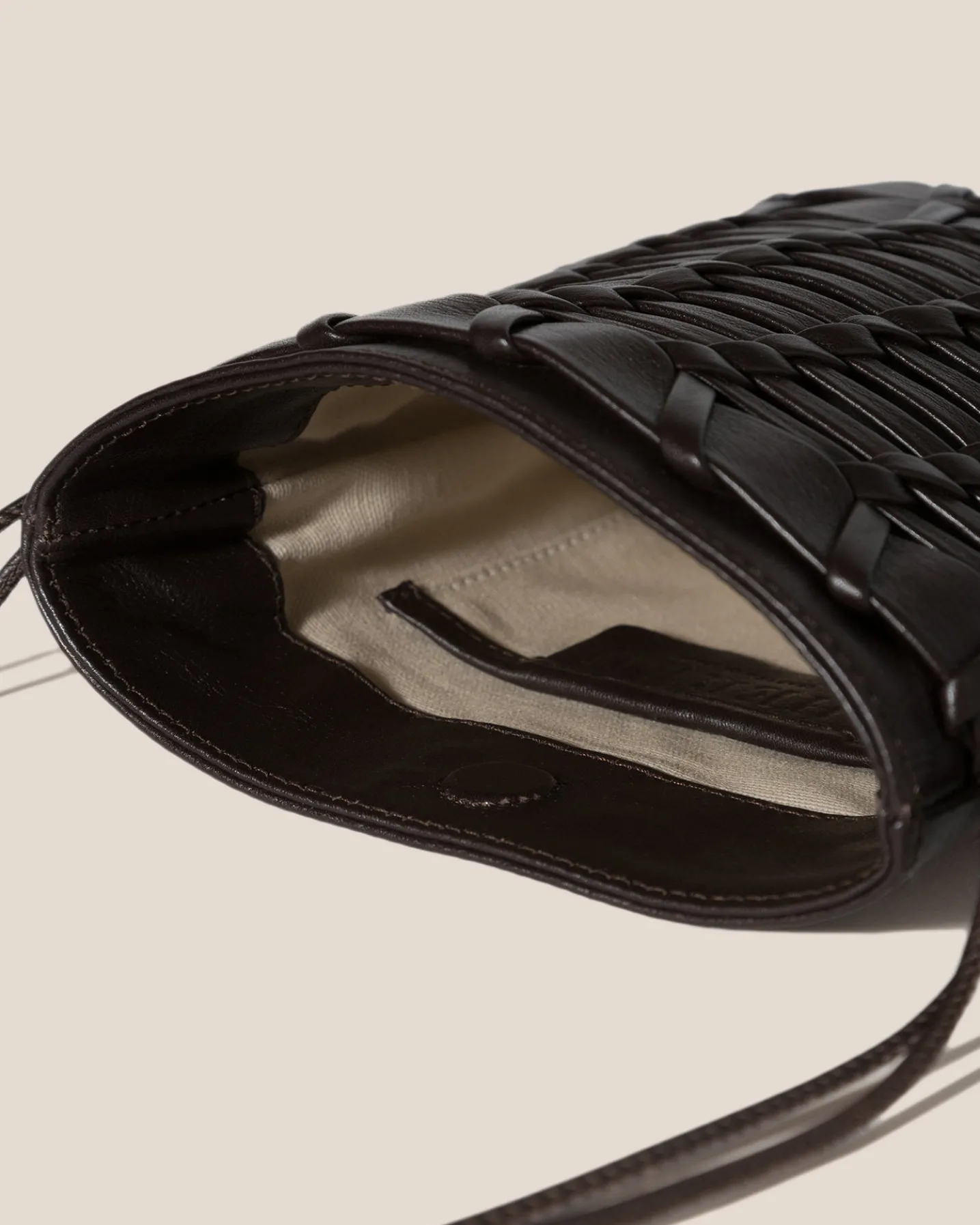Flat square crossbody bag crafted in soft calf leather, with a handwoven front pocket.