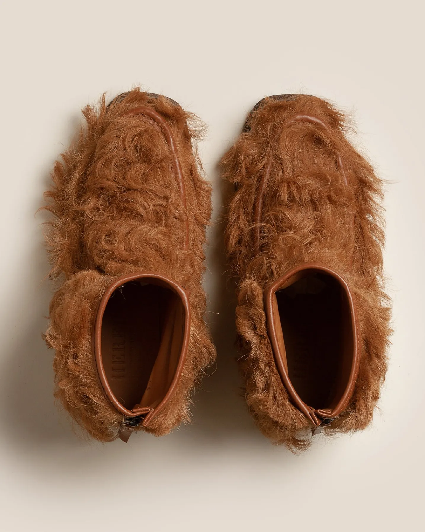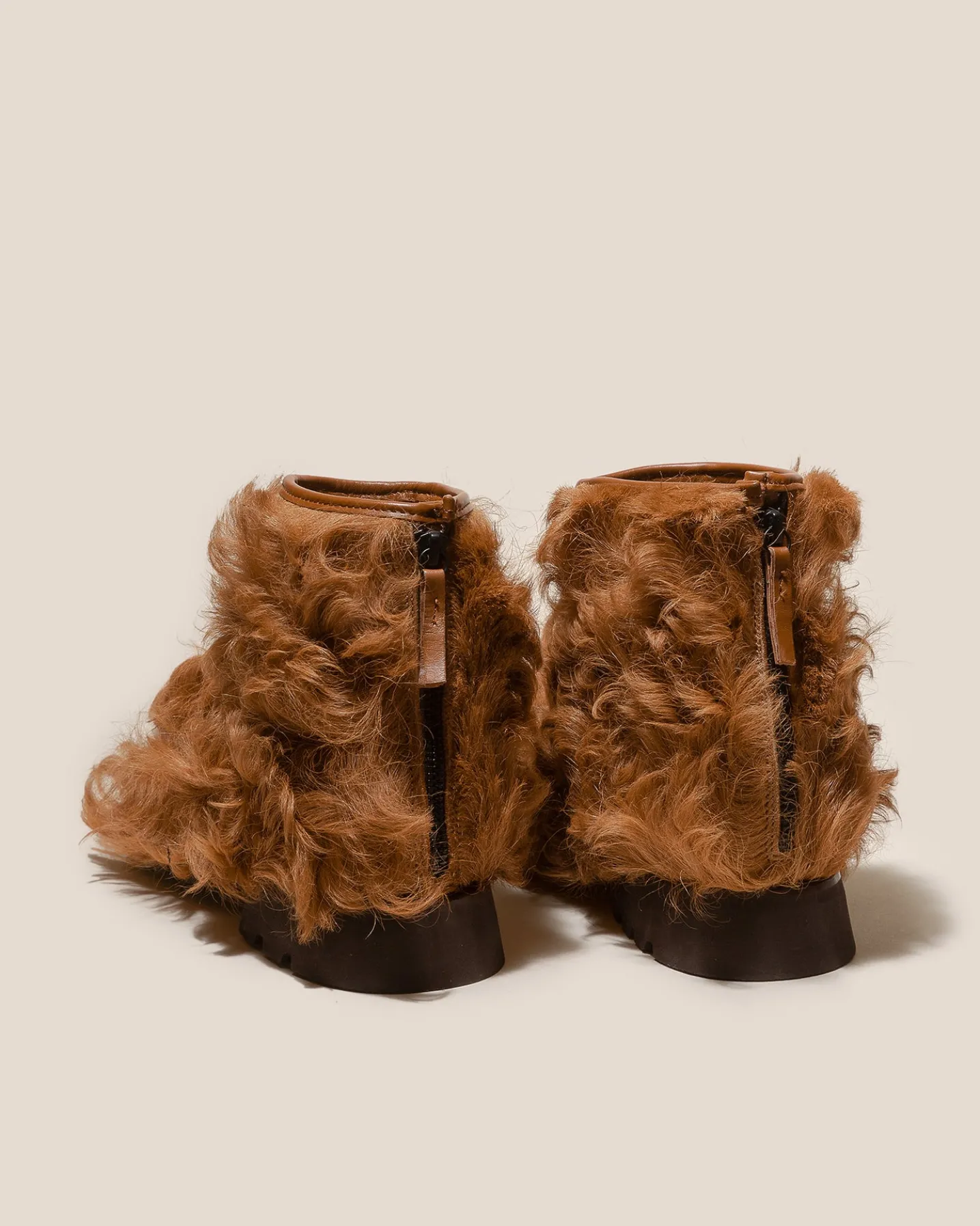 Back zip ankle boot loafer crafted in long hair shearling lambskin, built on a blown rubber tread sole.