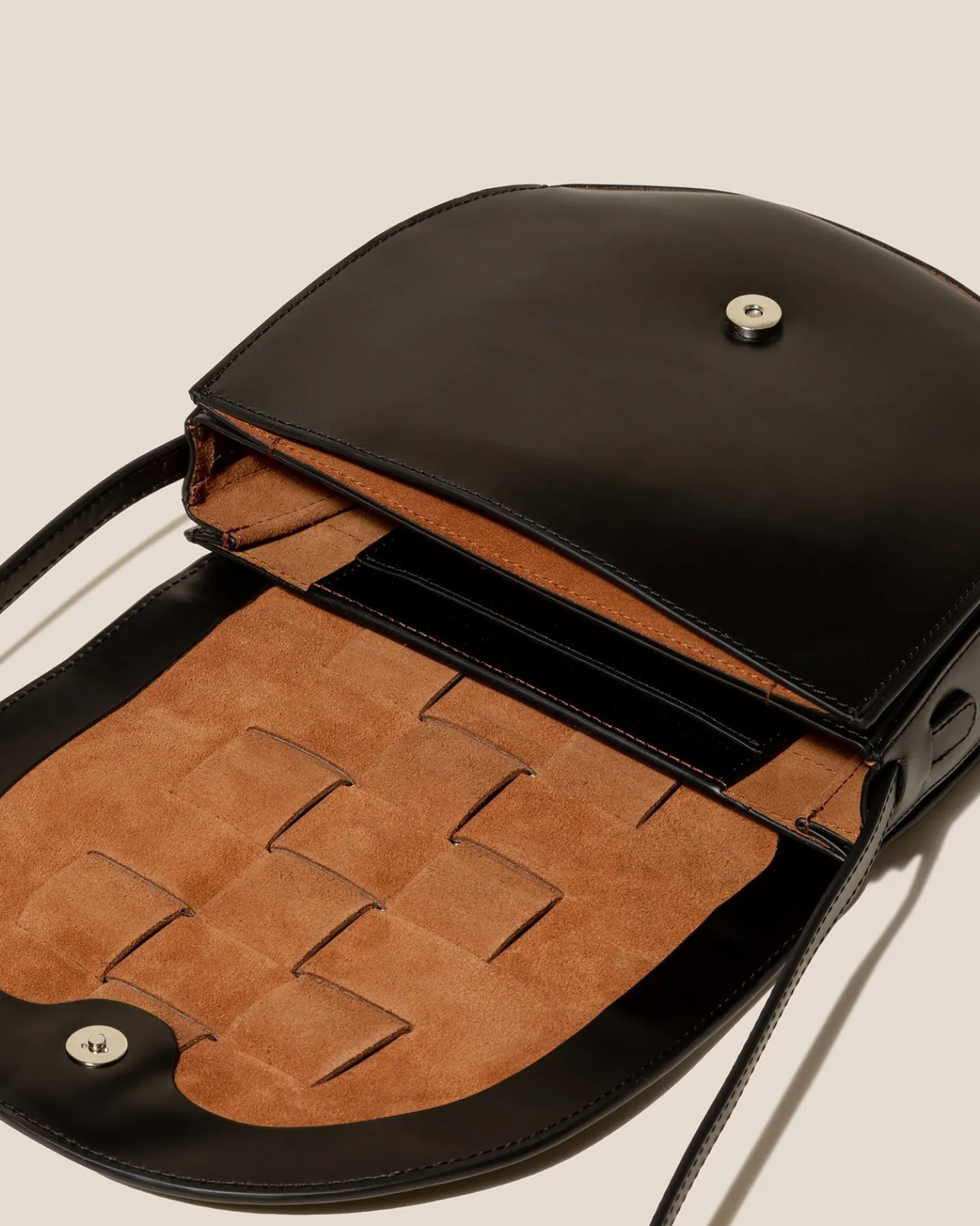 Satchel bag with interwoven front detail, crafted in Spanish leather and lined with calf suede.