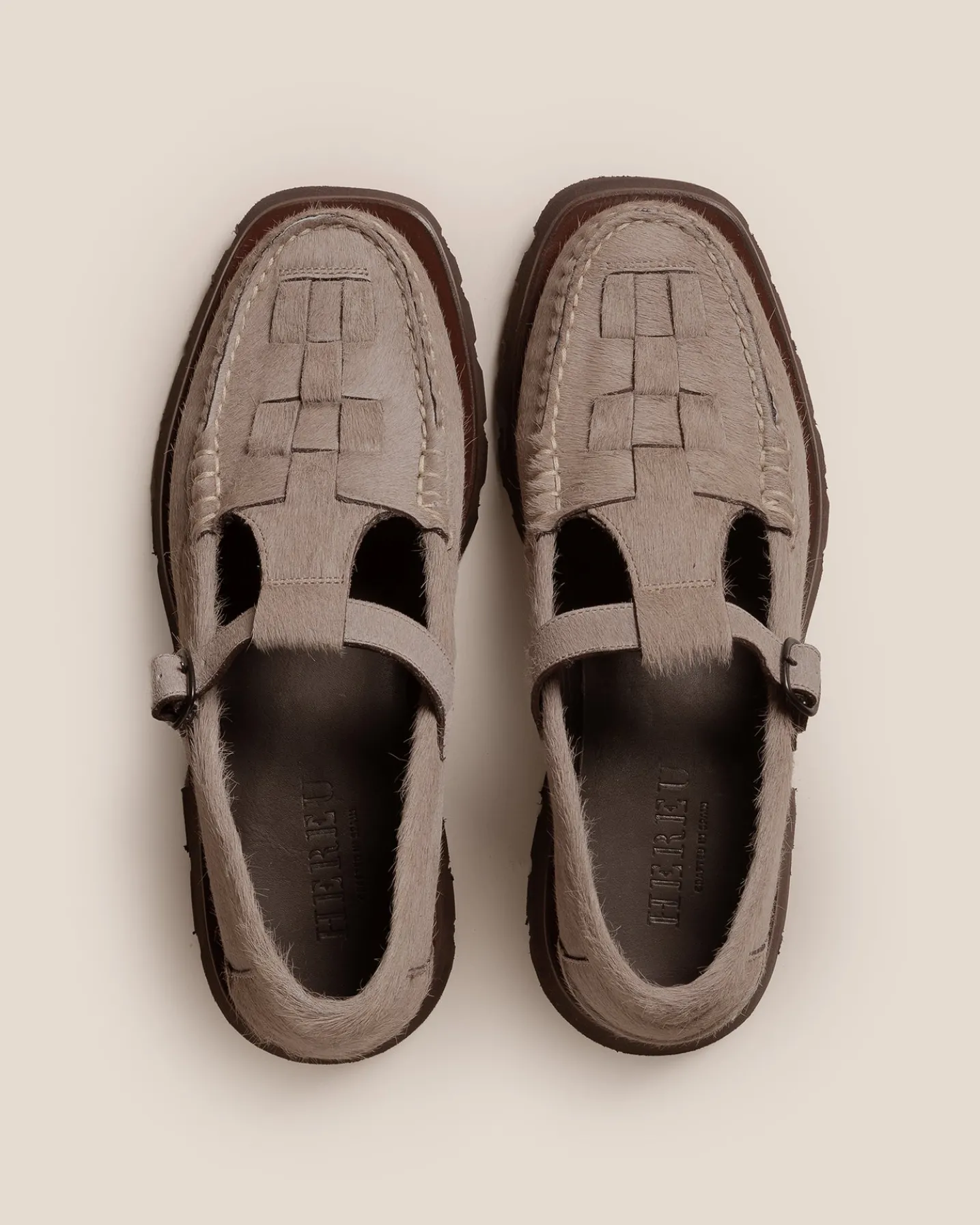 Interwoven T-bar loafer crafted in calf hair. The upper has been hand-sewn using the traditional moccasin construction.